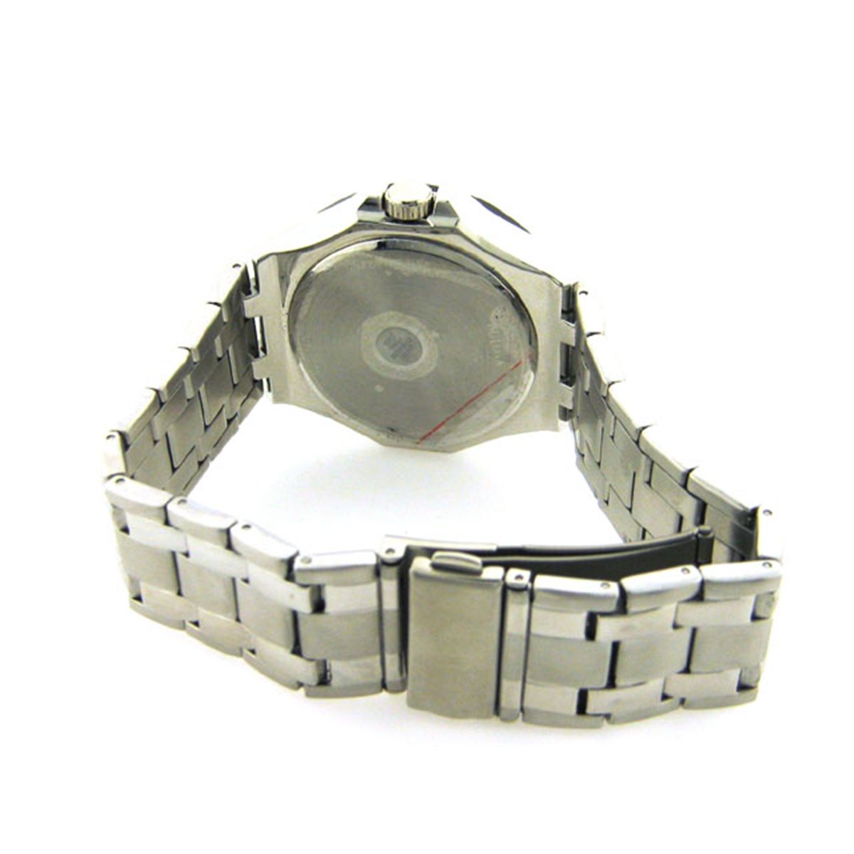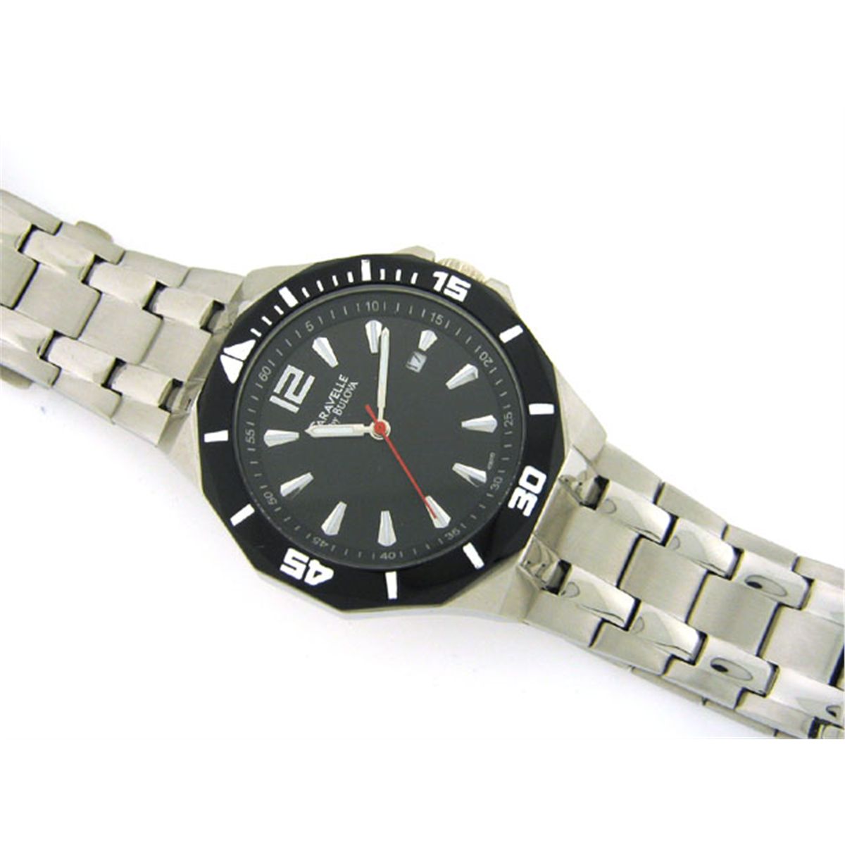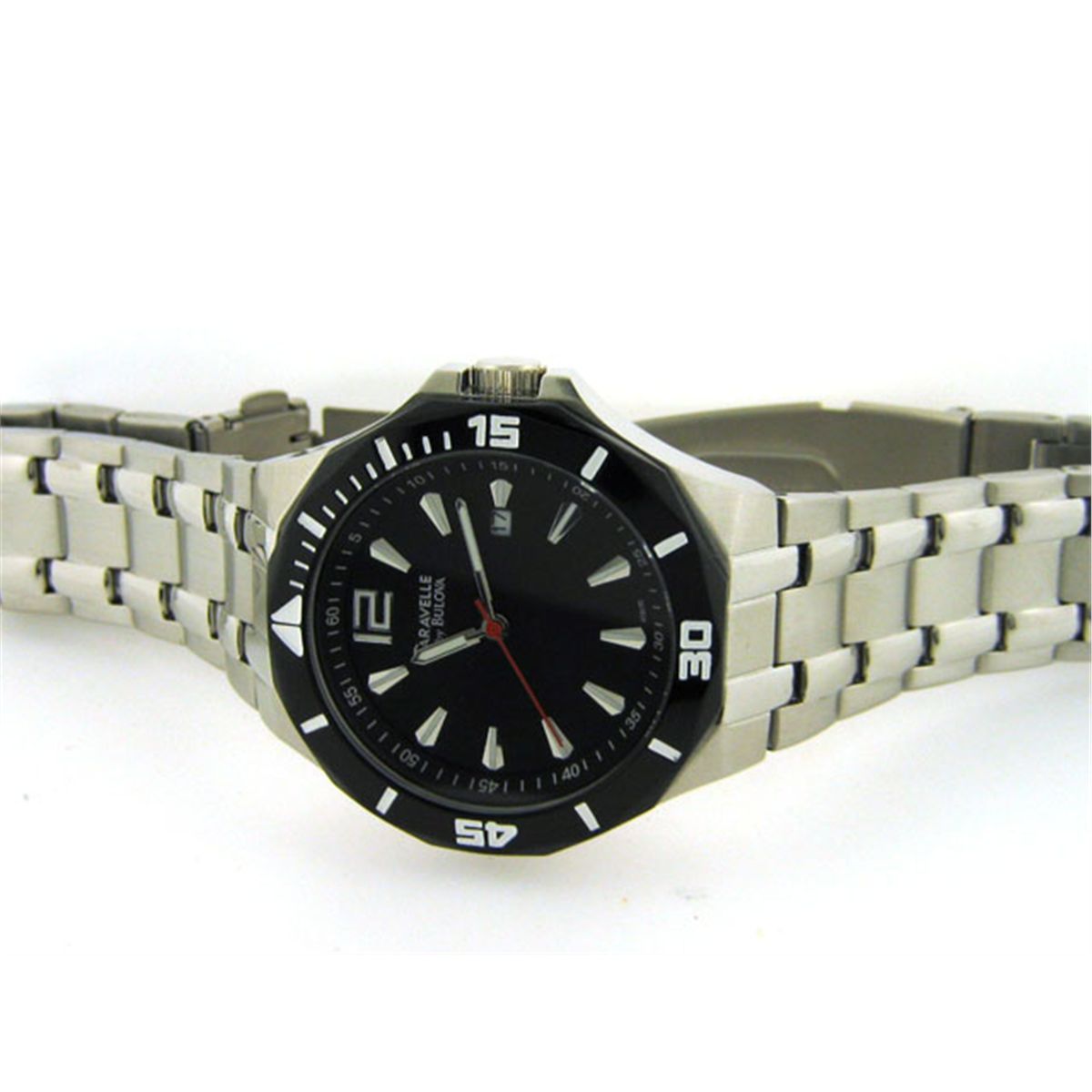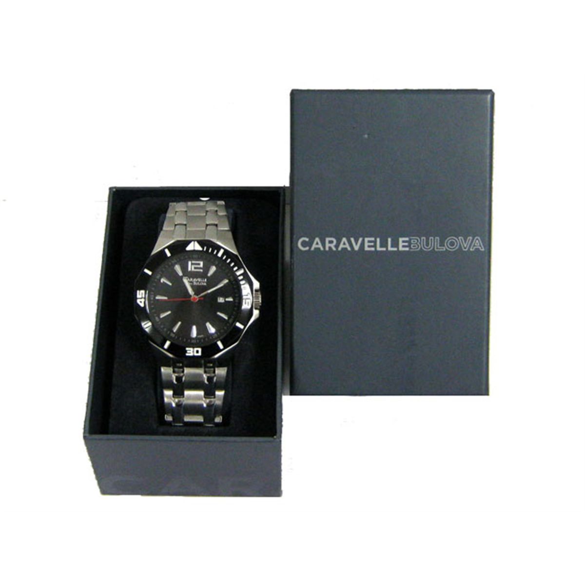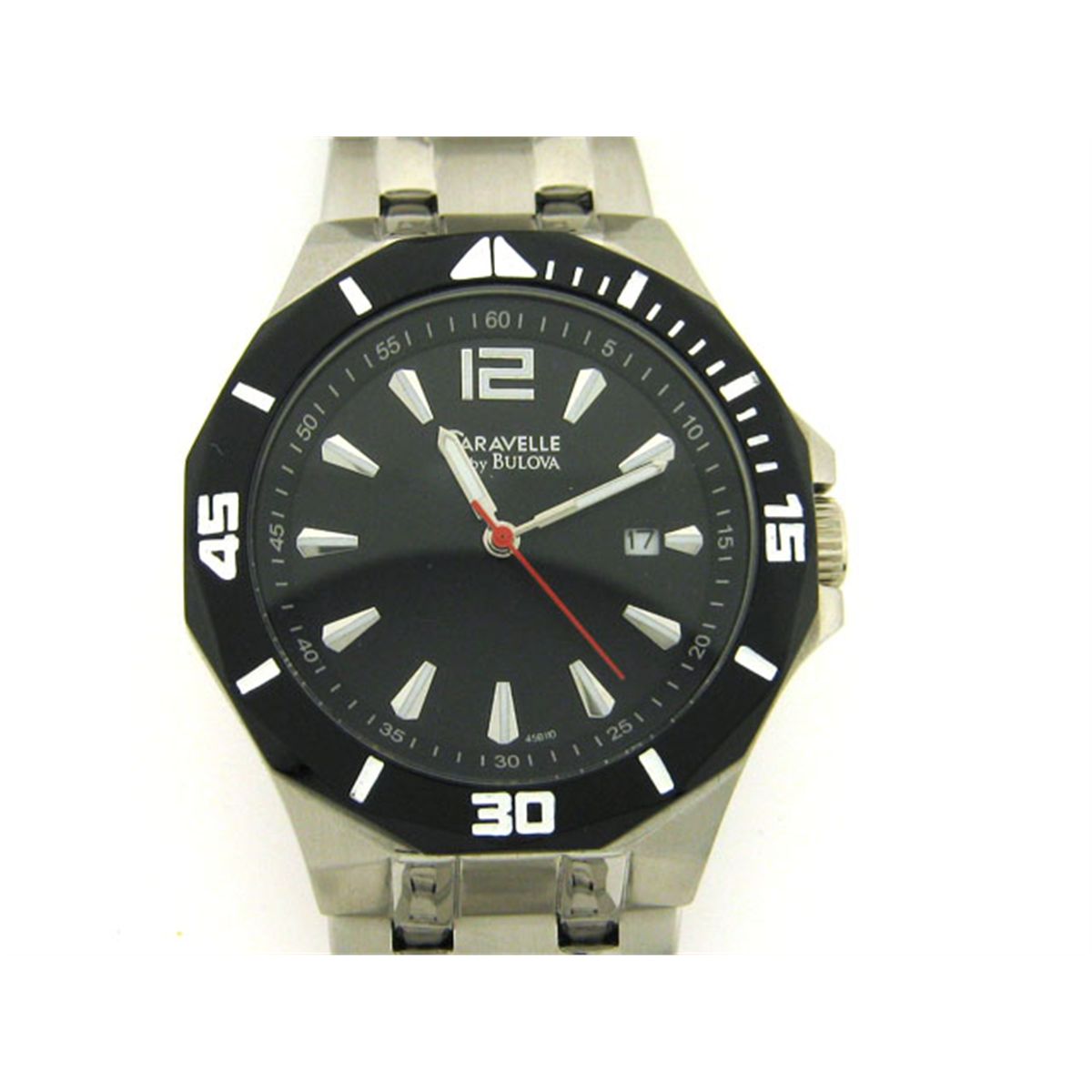 This is a Caravelle by Bulova Men's 45B110 Black Dial Stainless Steel Watch with the following features: all-black bezel and matching dial; luminescent silver-tone stick hour markers; dodecagon-shaped bezel is with thick hour-and-minute markers; date window at three o'clock; stainless steel bezel, case, and band; fold-over-clasp with a double-push-button safety; Japanese-quartz movement; Mineral crystal dial window protection; Water resistance to 99 feet (30 M); 41 millimeters Case diameter; 12.4 millimeters Case diameter; and 24 millimeters Band width.