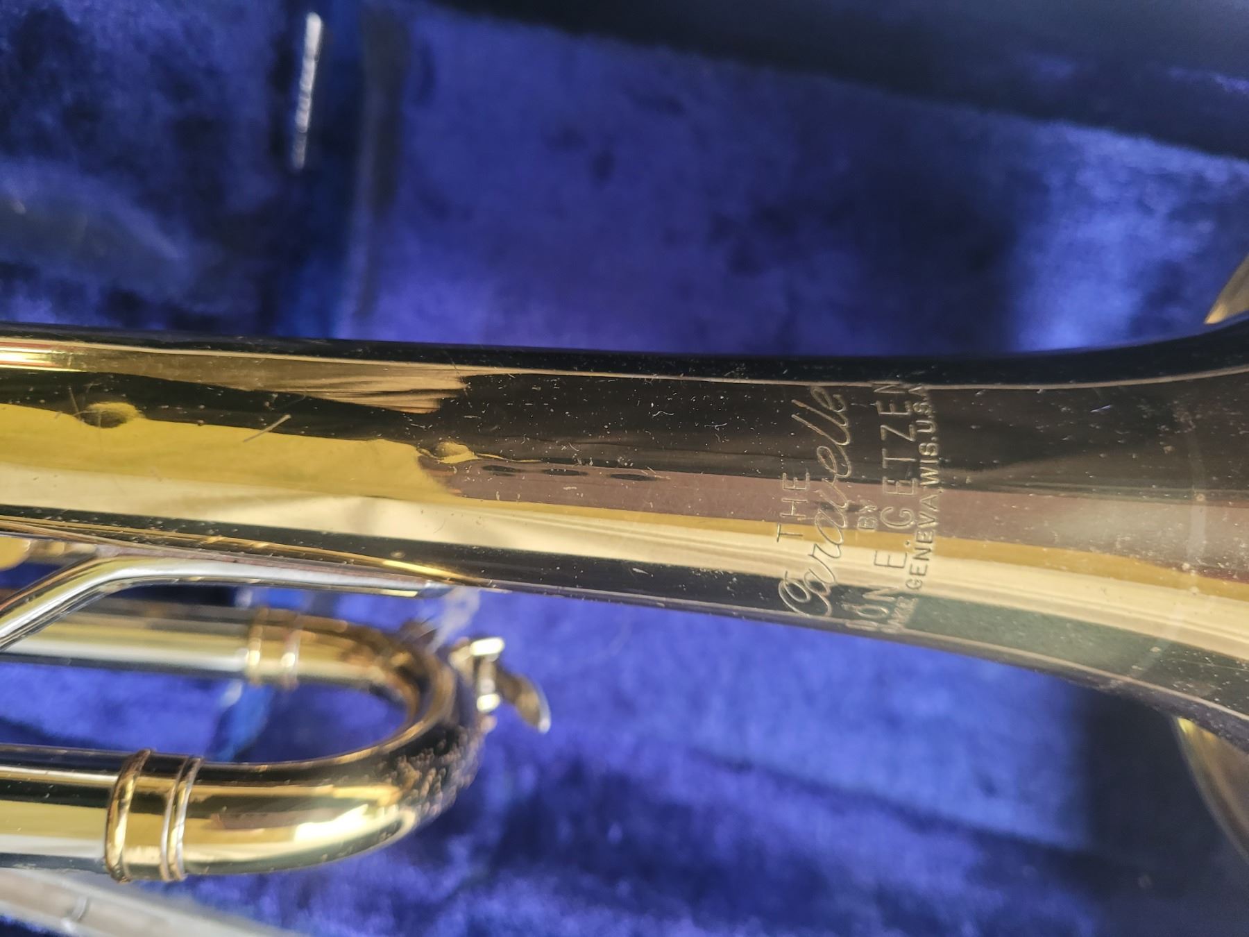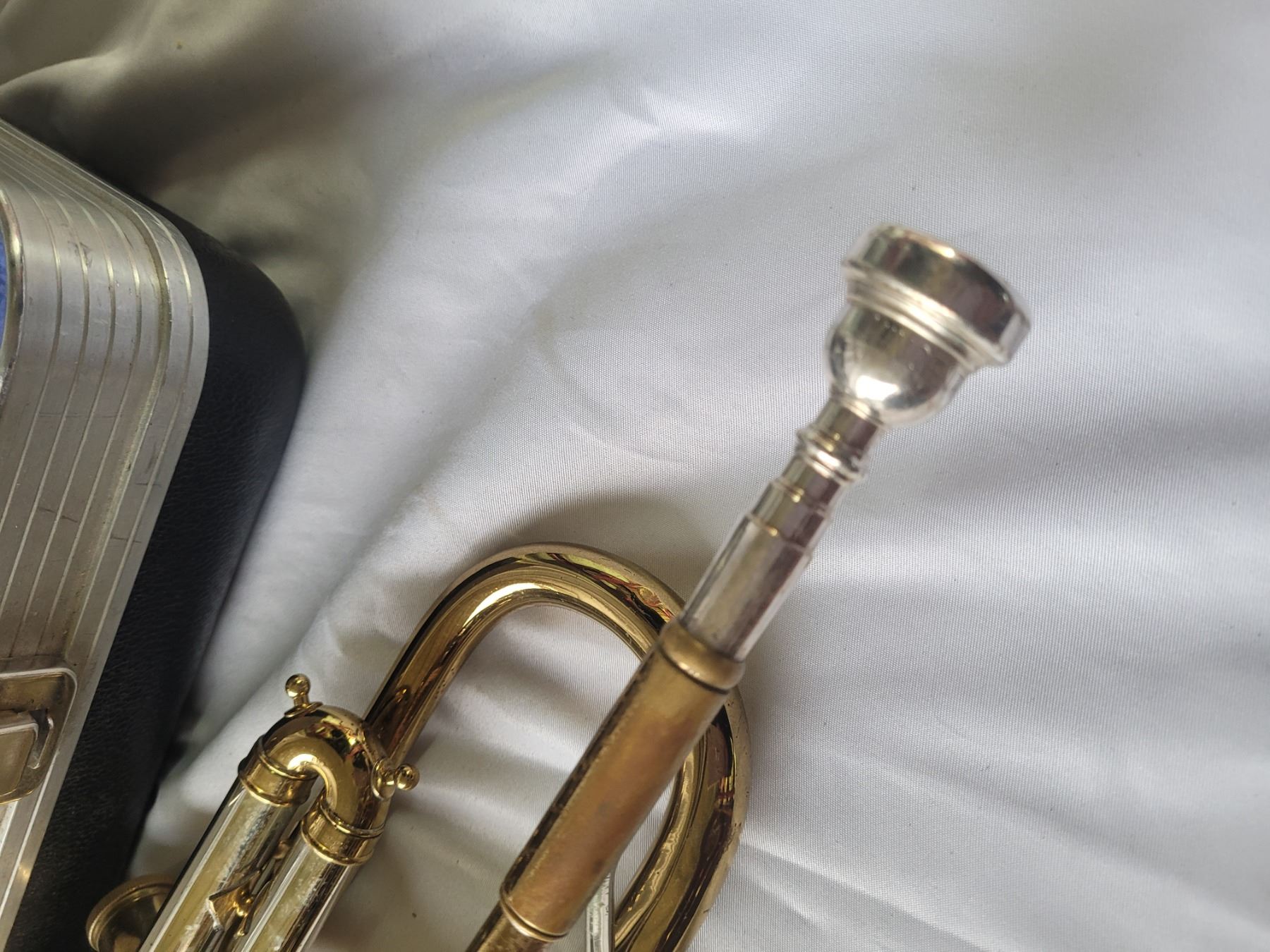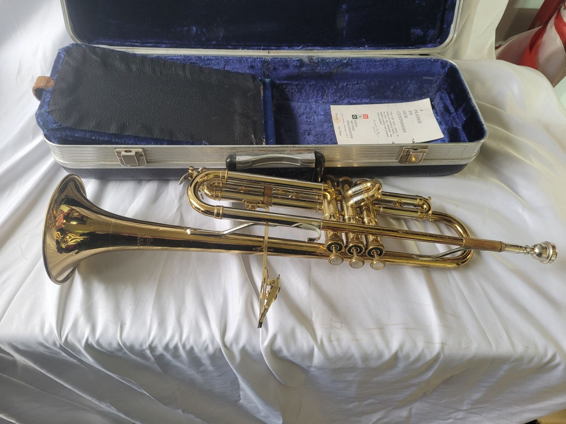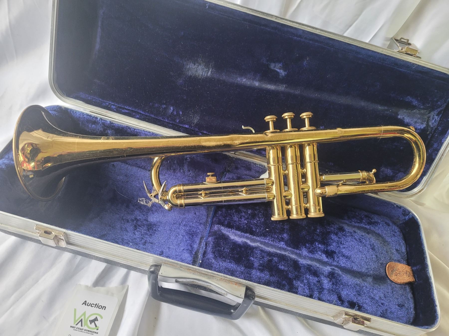 Brass Trumpet in hard carry case, note a couple of dents on the trumpet. Pickup at 10 am