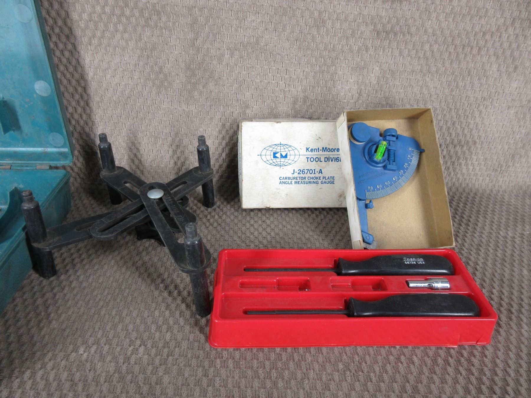 Carb Tools - Kent-Moore choke plate angle measuring gauge, Snap-on screw driver setand KM carb stand