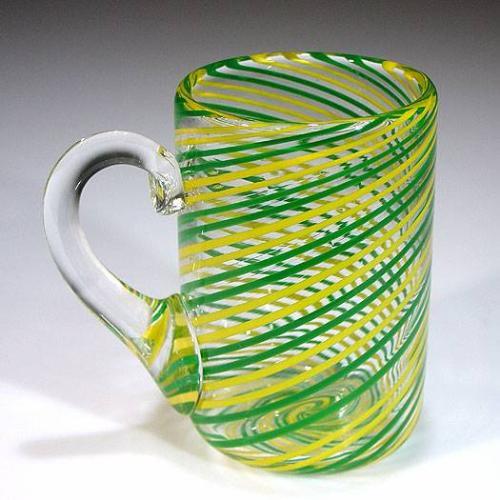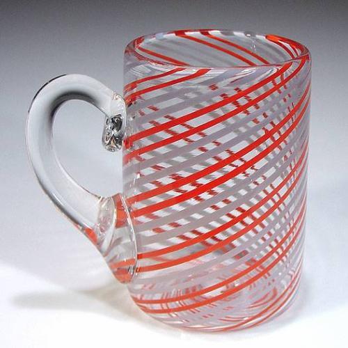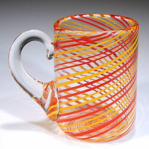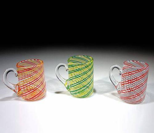 Carberry Glassworks, set of 3 demitasse handled glass mugs in multi-colored spiral ribbon designs. One each: red/white, red/orange, green/yellow. Average height 3 1/2" diameter 2 1/4". Donated by: Morgan Seeley.<p>Proceeds from the auction will go to benefit Santa Cruz, California glass artist Steven Lundberg, who, after 30 years of blowing glass locally, was diagnosed with amyotrophic lateral sclerosis, or ALS (Lou Gehrig's disease). This auction is a fundraising effort to help Steve meet the challenges of this disease.<p>Costs of treating ALS over a period of time can be exorbitant. In the short-term, Steve needs basic equipment such as an electric scooter and pointing devices to help him read and write.<p>Please join us for this auction, and help support a friend. Check out our other auctions to see the 150 paperweights, vessels, and glass sculptures from internationally known glass artists, donated by generous artists, galleries, and glass collectors from all over the country. Please contact us at 1-800-538-0766 or (831) 427-1177 for more information, or see <a href=http://www.selman.com/press target=_blank>www.selman.com/press</a>.