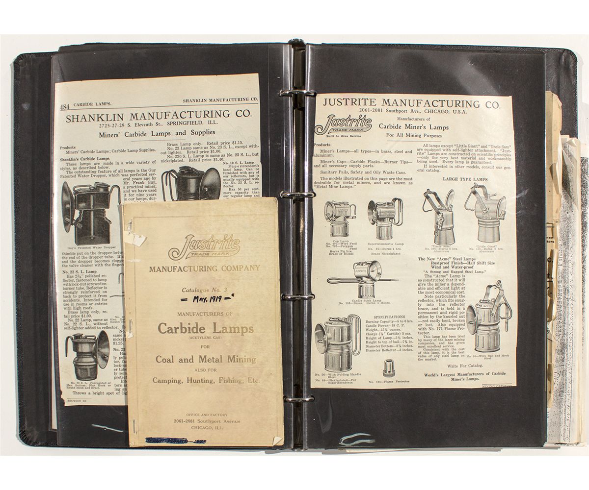 c1880 A large binder containing advertisements and descriptions of all types of carbide lamps, along with a few articles, from many publications. Some of the ads are original and others are photo copies from such publications as The Engineering & Mining Journal, the Justrite Company, the Mining and Scientific Press, and the Pacific Miner, among others. There are approximately 48 pages in plastic sleeves plus about 50 pages of loose-leaf insertions. Also included is an original 28-page Justrite catalog from 1919. - HKA#65128