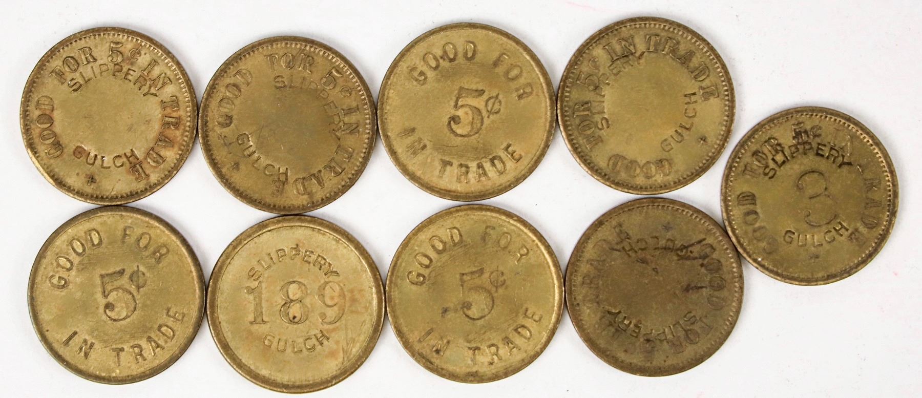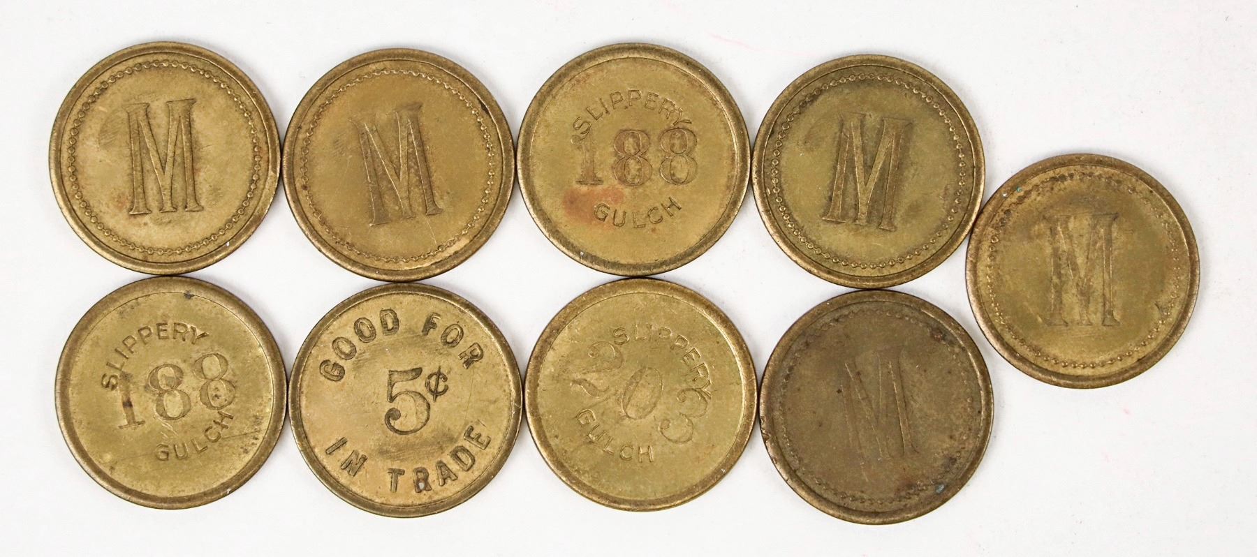 Token guys: these nine tokens all came out of a huge raw, unsorted batch of Colorado tokens. Possibly Cokedale. (Tokencatalog.com attributes them to The Carbon Club 1909, Cokedale)