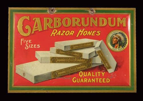 Carborundum Razor Hones Tin Sign. Beveled Chain Hanger. Some minor Paint Loss around Gromet Holes. Some minor scratches. 11x 8. Good Cond.