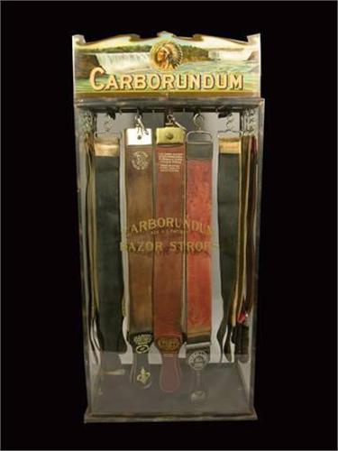 Carborundum Razor Strop Case. Tin Litho Marquee. Comes with 20 Razor Strops. 33x15x11. Very Good condition. One side glass Broken. Very Rare.