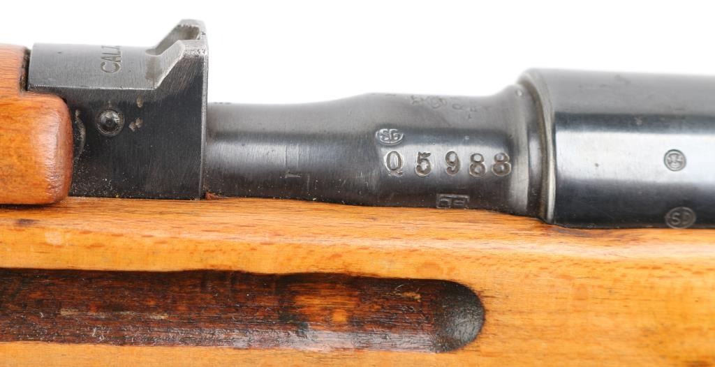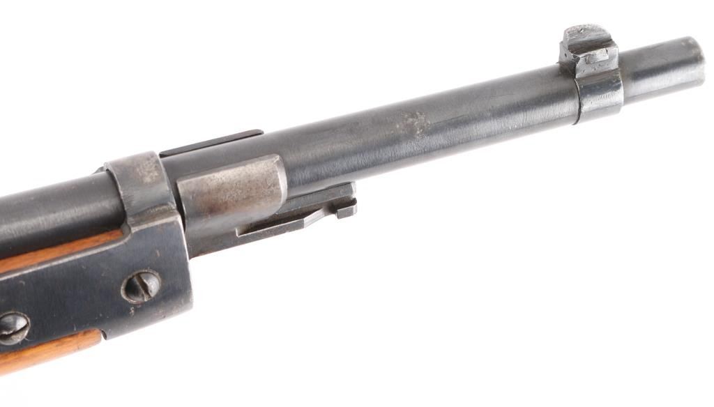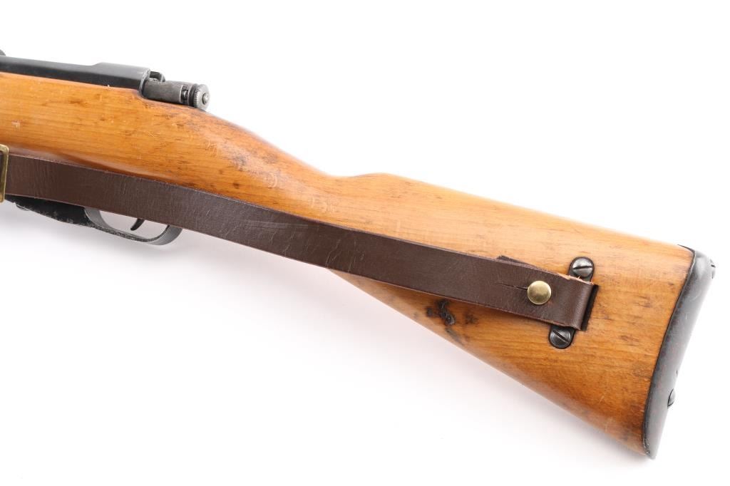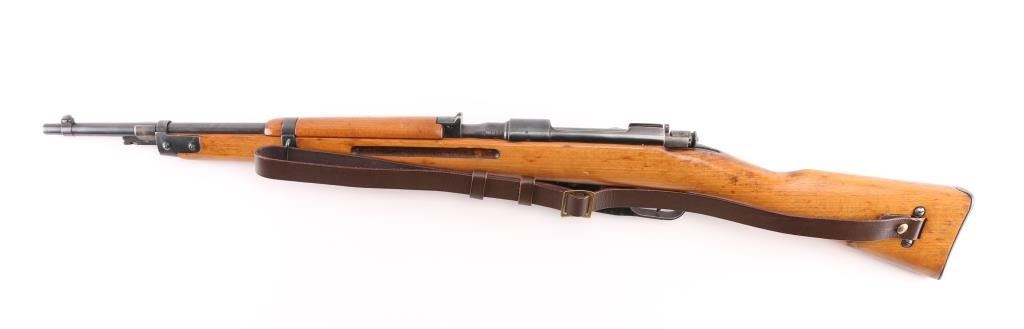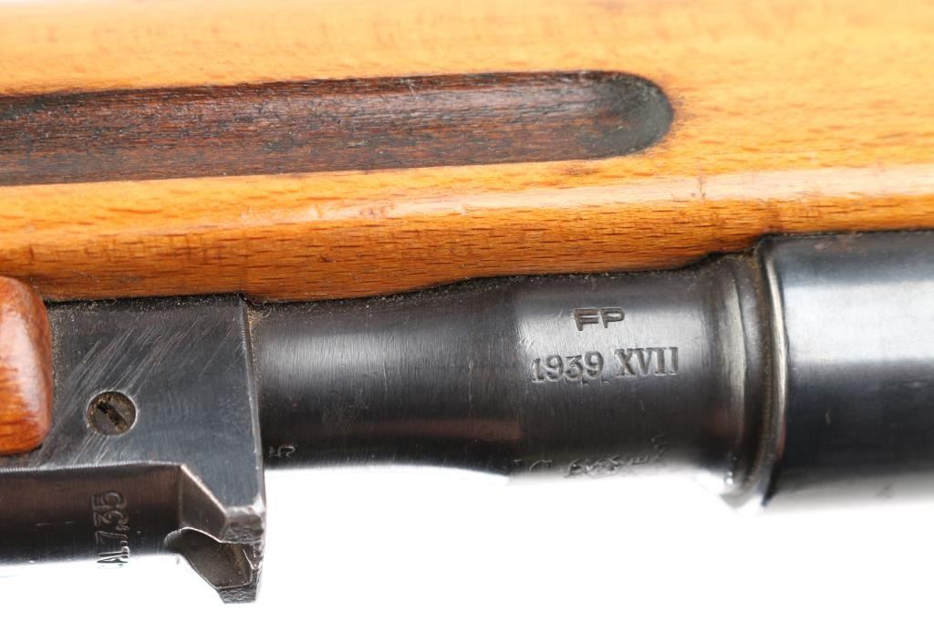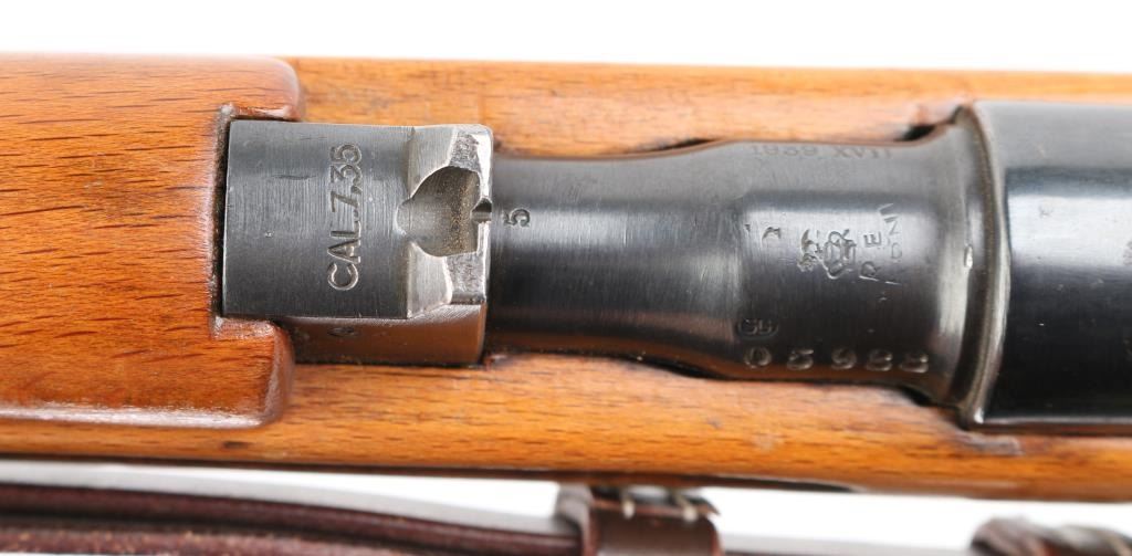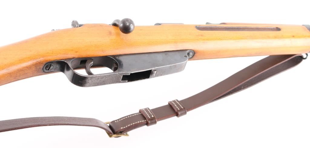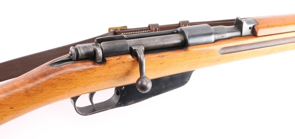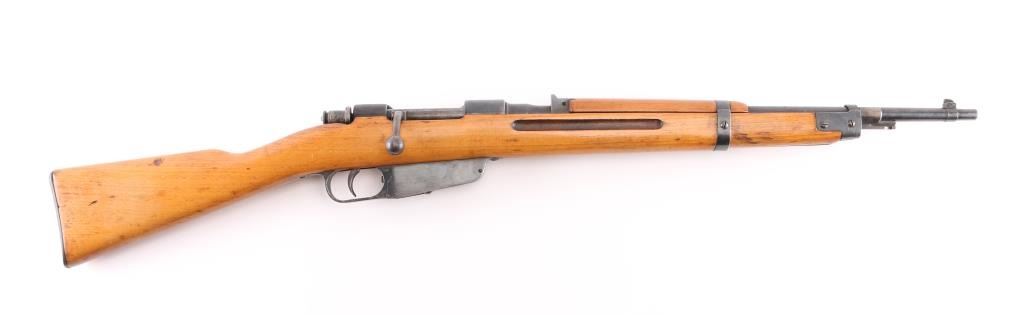 Italian military carbine dated 1939. Features approx 21" barrel, bayonet lug, fixed sights, side mounted sling swivels, butt trap, bent bolt handle, manual safety, Mannlicher type action uses en-bloc clips (clips not included). Bore is excellent condition, bright and clean rifling. Retains 90% finish, with some pitting around lower receiver. Stock is in very good condition with some small dents or nicks. Marked "1939 - XVII". Includes excellent leather sling. Condition is NRA Excellent. C&R Firearm.