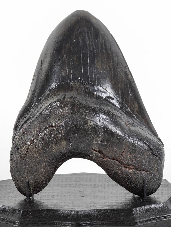 Carcharodon Megalodon Shark's Tooth. Even though Carcharodon megalodon was the largest shark that ever lived growing to more than 50 feet in length, most of the teeth found are only 3-4 inches in length. Teeth over 5 inches in length are in great demand and the magic number is a full 6 inches, which is the size that every collector aspires to own. This immense 6.35 inch long 4.5 inch wide 15 million year old Carcharodon tooth was found in the muddy river waters of South Carolina. Estimating the length of a shark at about 10 feet in length to every one inch of tooth, this behemoth would be over 60 feet long. This huge tooth has fairly complete black enamel on both the front and back but does have about 10-15% repair of the left side of the blade and about 10% restoration on the top of the black front root. This is an opportunity to purchase a really huge shark's tooth without paying well over $1500. Comes with a 7 x 5 inch custom wooden black stand for display.