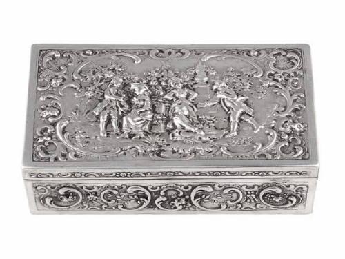 Silver, gross 196 g. Rococo scene on the cover. Marked: German, 800- mark of fineness, Hungarian import hallmark, Late 19th century. Size: 12.5 x 7.5 x 3.5 cm