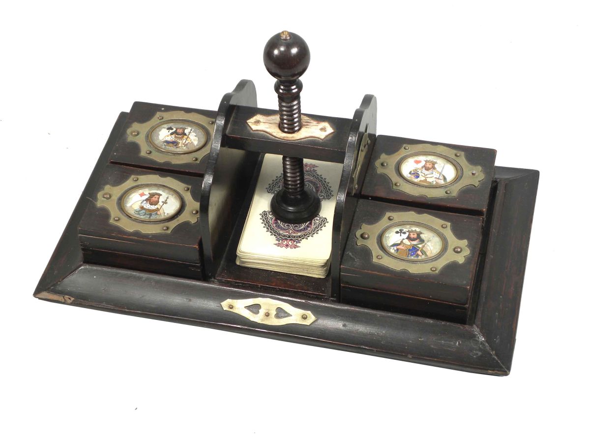 Card Press with four boxes of gambling chips. Mahogany carrying case with brass trim and celluloid card motif detail on each box. Paint flaking from celluloid otherwise very good condition. 12 X 7 X 7 inches.