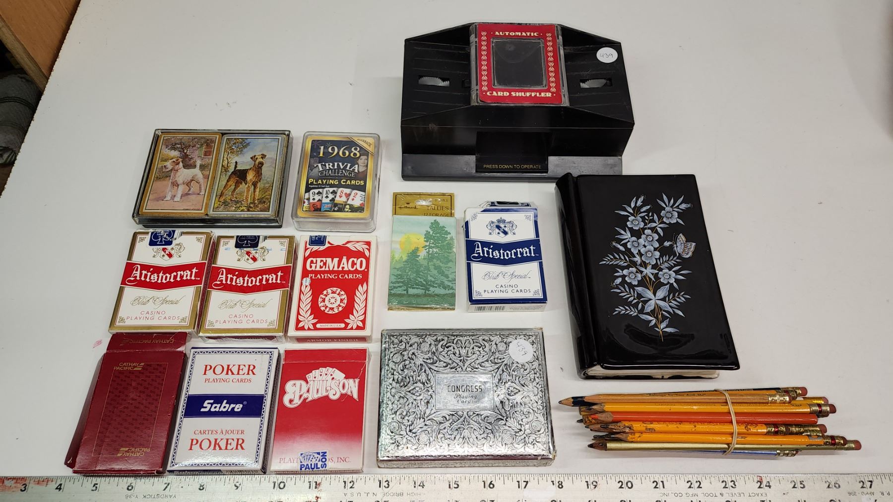 Card Shuffler, Bridge Scores, 14 Decks of Cards, Card Box, Pencils
