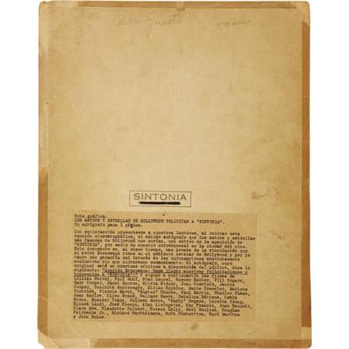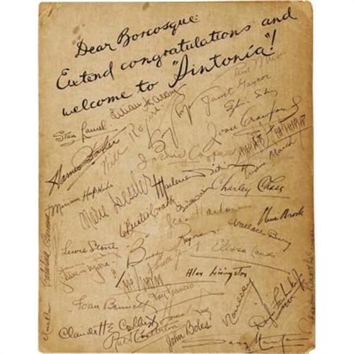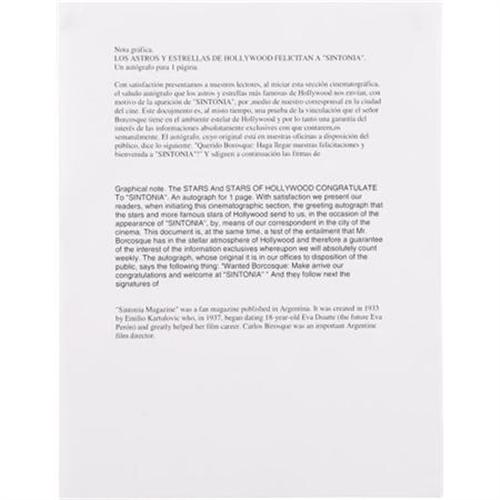 <B>Card Signed by Hollywood Greats Including Jean Harlow, Clara Bow, Others.</B></I> A 10.5" x 13.5" card signed by a host of early stars including Jean Harlow -- an elusive signature to acquire, as her mother "Mama Jean" signed most of her autographs. This one is the real deal, an authentic Jean Harlow signature. Another rare autograph from Will Rogers appears towards the center. Rogers tragic death in 1935 makes his autographs quite rare, and dates the card to pre-1935. Also included are: Clara Bow, Charley Chase, Fredric March, Stan Laurel, Marlene Dietrich, Joan Crawford, Spencer Tracy, Gary Cooper, Claudette Colbert, Richard Barthelmess, Douglass Fairbanks Jr., Janet Gaynor, Joan Bennett, Buster Crabbe, Wallace Beery, Ruth Chatterton, Marie Dressler, Colleen Moore, Loretta Young, Buddy Rogers, Paul Muni, John Boles, and many more. All signatures are in various shades of black ink, and though a few of them overlap they are all in incredible shape considering the card's age. The piece was dedicated to the Argentine film director Carlos Borcosque, on behalf of <I>Sintona</B></I> fan magazine, and reprinted in the journal along with a note in Spanish to the fans (attached en verso). A treasure trove of fabulous autographs made all the more desirable by the inclusion of an elusive actual Jean Harlow signature. In overall Very Fine condition with age-toning to card and minor corner and border wear. <I>Accompanied by a COA from PSA/DNA.</B></I><BR><BR><b>Shipping:</b> Flat Material, Small (<a target="_blank" href="http://www.heritageauctions.com/common/shipping.php">view shipping information</a>)