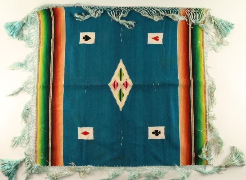 Dark turquoise serape with rainbow colored edges and light blue fringe and tassels. Center shows a white diamond with storm pattern and a card of each suit represented. Measures 32"x29 1/2". Two small holes on one edge, otherwise good. Great table cover for the gambler.