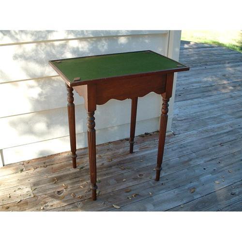 Early card table with wood cutouts of spade, heart, club, diamond on green felt top. Believe to be mahogany wood and possibly English. Spindle legs with groves. No drawer or hardware. As is -- damage on felt, and top is not attached. An unusual piece of furniture.