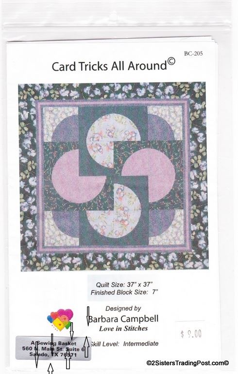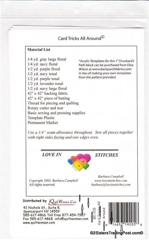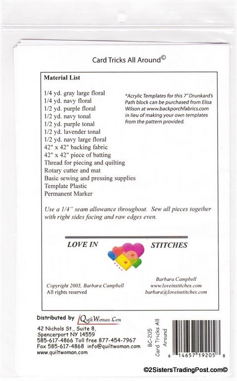 Pattern #BC-205 'Card Tricks All Around" designed by Barbara Campbell and distributed by Quilt Woman.com Finished quilt is 37" x 37" skill level intermediate MSRP $9.00 NOTE: there is a light fold in the pattern see images for details