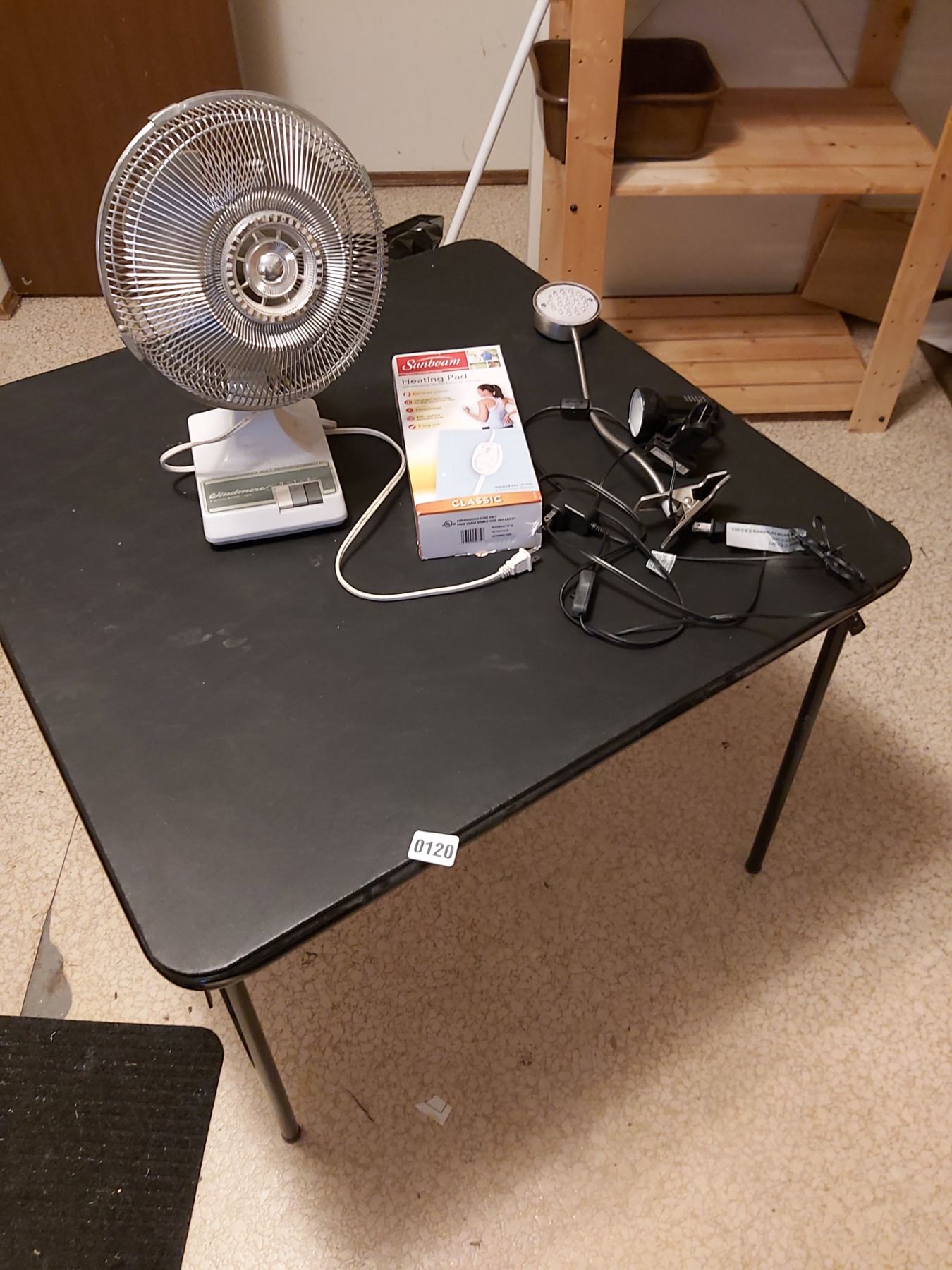 Card table (33.25" sq, 27.5" H), Windmere 9" oscillating fan, Sunbeam heating pad, 2 clip-on lights