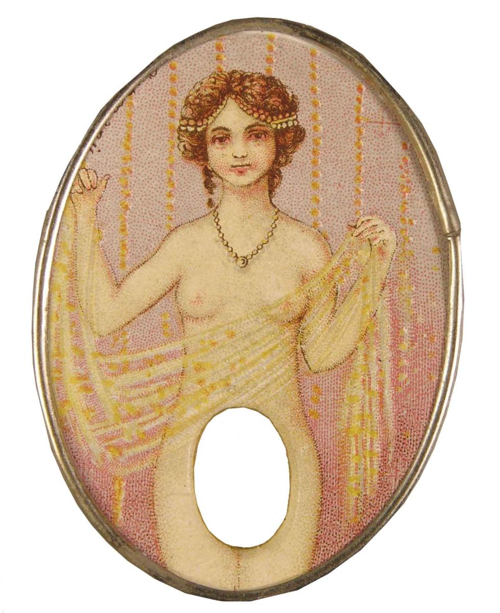 Cardboard Naughty in nickel frame. Use two fingers to complete image. Excellent condition. 2 X 2 1/2 inches.