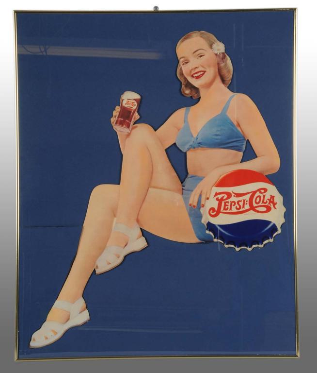 1949. Rare, large die-cut blonde teenage Pepsi girl is framed with restoration to bottom foot. Condition (8.5 - 8.8, Excellent). 17" x 38".