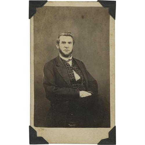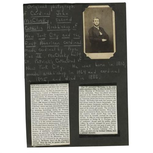 <B>Cardinal John McClosky <I>Carte de Visite.</B></I></B></I> 2.5" x 4", mounted on black photo album paper with biographical information, fine clear image with slight toning at edges. John McClosky (1810-1885) was the second Catholic Archbishop of New York City and the first American cardinal.<BR><BR><b>Shipping:</b> Flat Material, Small (<a target="_blank" href="http://www.heritageauctions.com/common/shipping.php">view shipping information</a>)