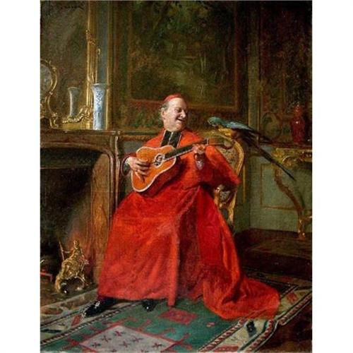 Museum-quality French School oil painting on canvas mounted on cardboard by French painter Bernard Louis Borione (1865 - ) of a Cardinal playing the guitar while a blue parrot stands on the edge of the chair. Bernard Borione is well known for his intimate scenes of Roman Catholic clergy life. The painting is signed on the upper left in black "B. Borione." Borione is listed in Benezit (Dictionnaire des Peintres, Sculpteurs, Dessinateurs et Graveurs) where details of his work appear. He was a student of his father Guillaume-Marie Borione and of the artist Evariste Luminais. Borione's paintings sell in Christie's, Sotheby's, Bonham's and other first-rate auction houses. In good used condition with restoration and minor signs of wear as shown. Please ask questions, request additional photos and shipping costs before buying.