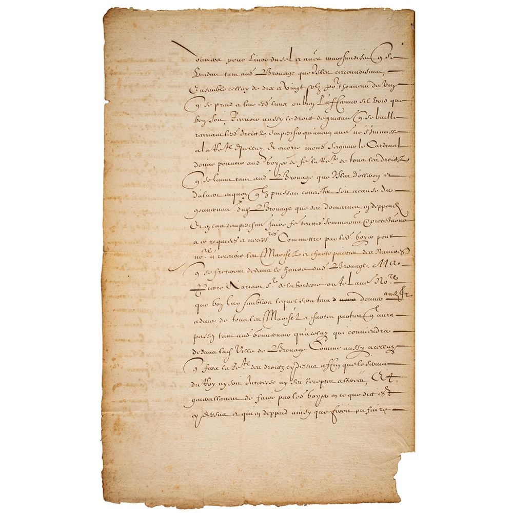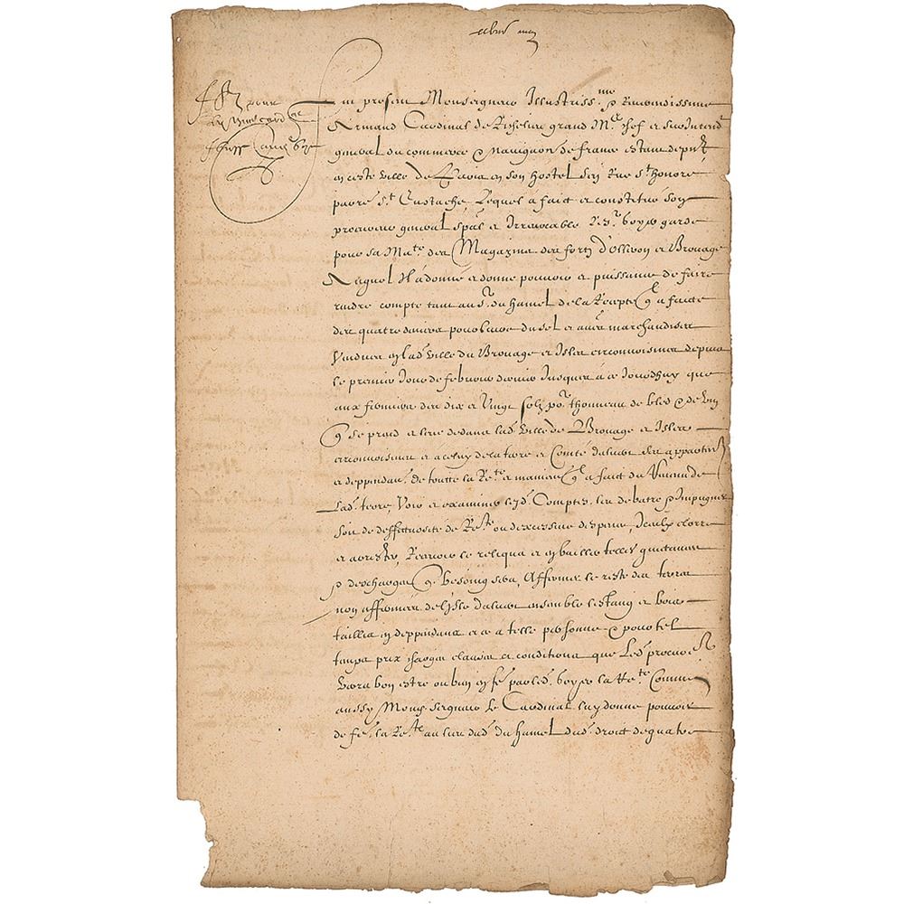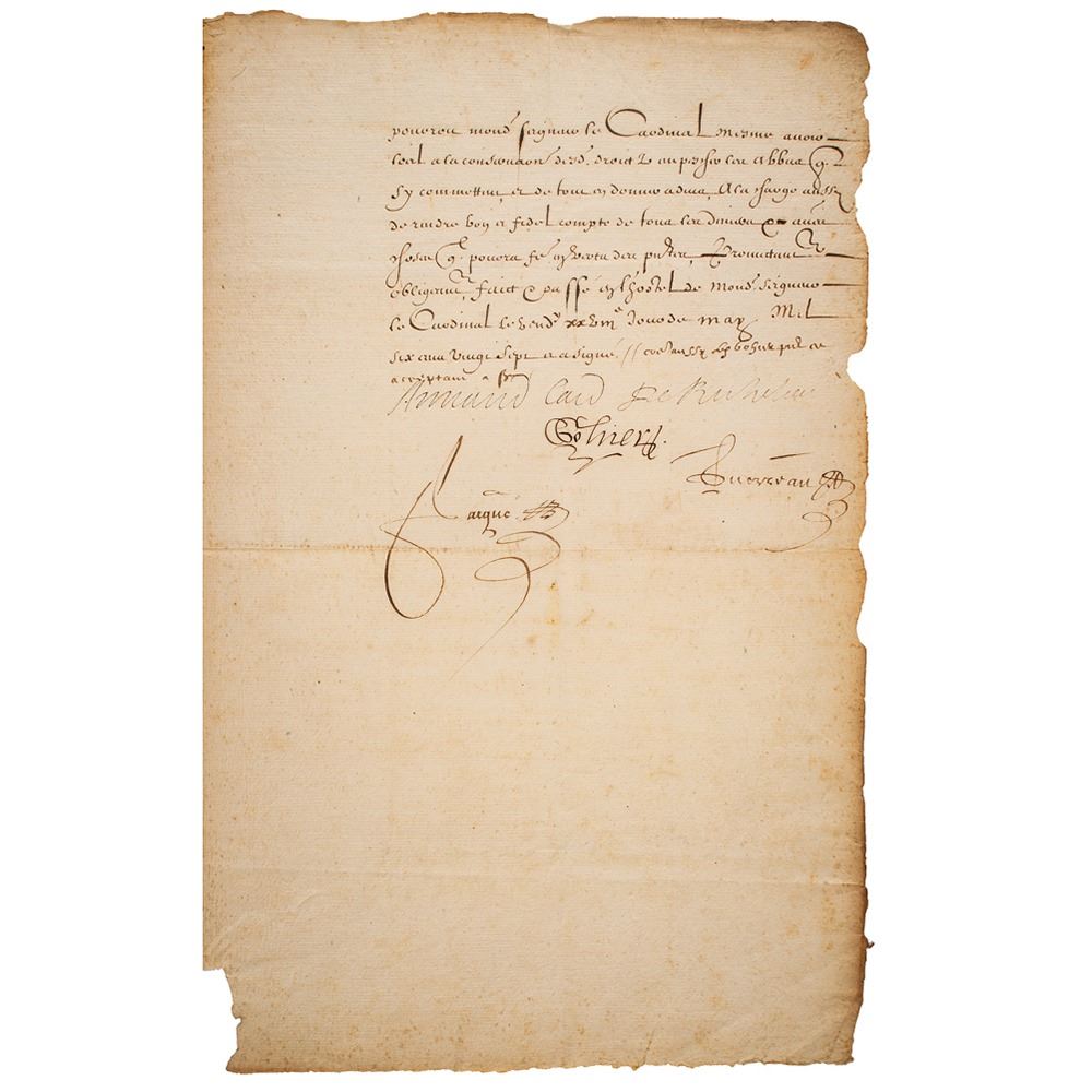 Manuscript DS in French, signed “Armand Card. de Richelieu,” two pages on two adjoining sheets, 8.5 x 13.75, May 28, 1627. Before a notary at his palace on the Rue St. Honore in the parish of St. Eustache, Richelieu confirms a power of attorney to Lord Colnert, Overseer of the Royal Forts and Castle at Ollnoy and Broue. Lord Colnert will have authority to collect money due for rents, duties, and other financial obligations in the town and regions of Brouages, a port city in the southwest of France. The document enumerates these sources of income in specific detail and gives instructions as to the disposal of these monies. In fine condition, with some paper loss to the bottom of the hinge, and along the right edge of the second page.