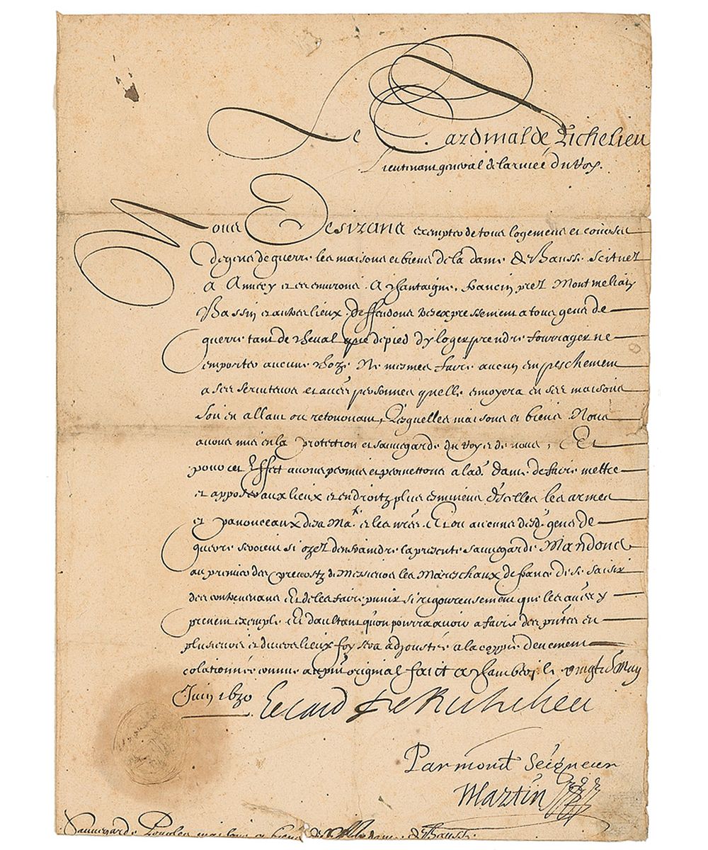French cardinal and statesman (1585–1642) who served as chief minister from 1624 until his death, widely considered the world’s first prime minister. LS in French, signed “le Card de Richelieu,” one page, 8.25 x 11.5, June 20, 1630. Letter to "Monsieur Desizana." In part (translated): "Exempt from all lodgings and counsel of men of war, the houses and goods of the lady of Bassi…we forbid very expressly to all men of war, either on horseback or on foot, to lodge there, take, forage or carry away anything, nor even make any obstacle to her servants and other personnel whom she will send to her houses, either in going or in coming, which houses and goods we have put under the protection and safeguard of the King and of ourself." In fine condition, with intersecting folds (central vertical fold passing through a single letter of the signature), light foxing and soiling, a few small edge tears and tack holes to top, and bottom edge apparently slightly trimmed.