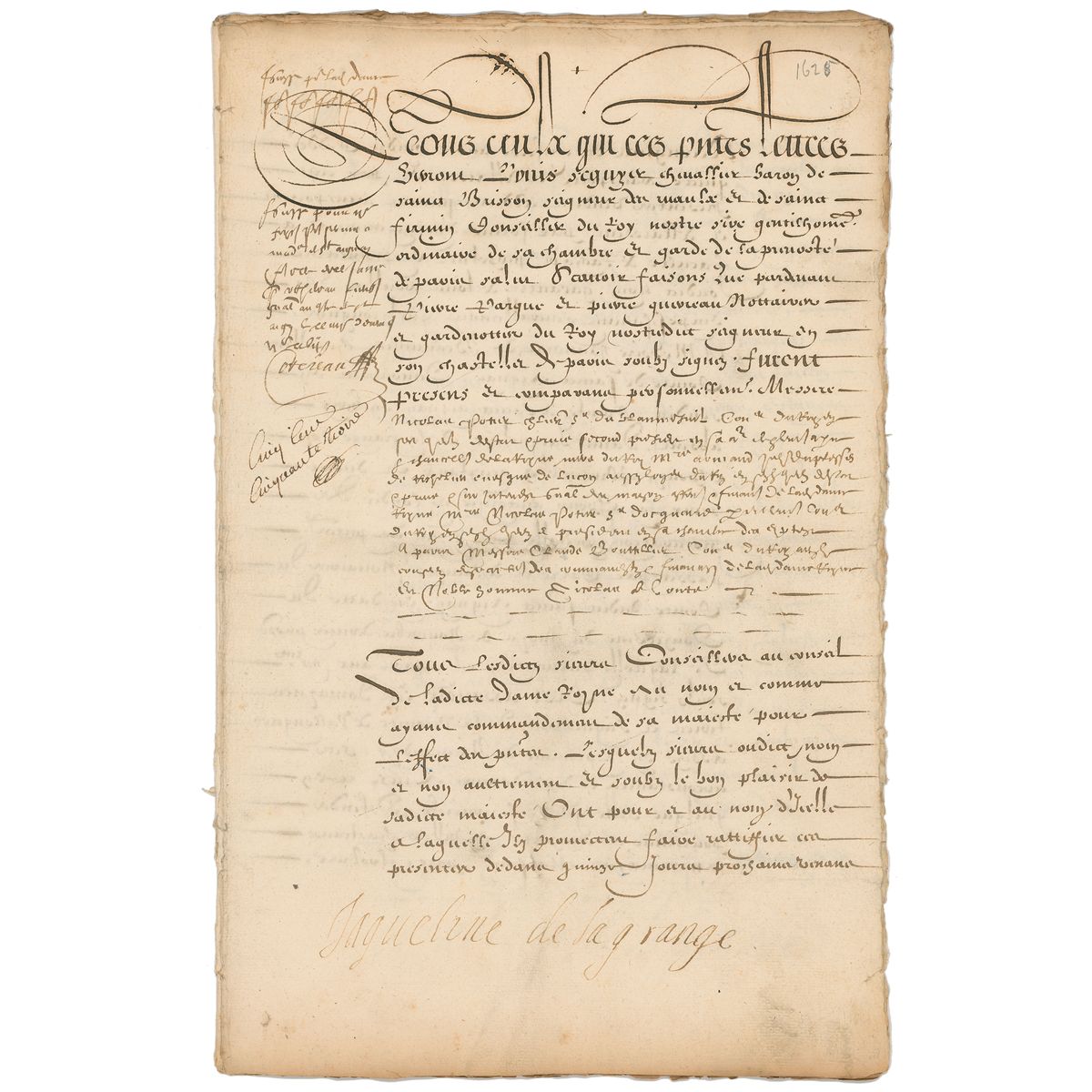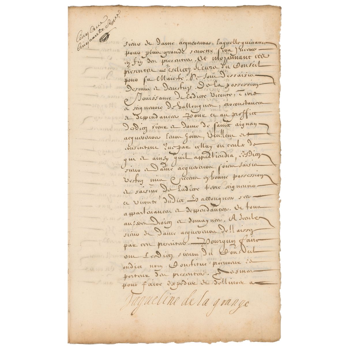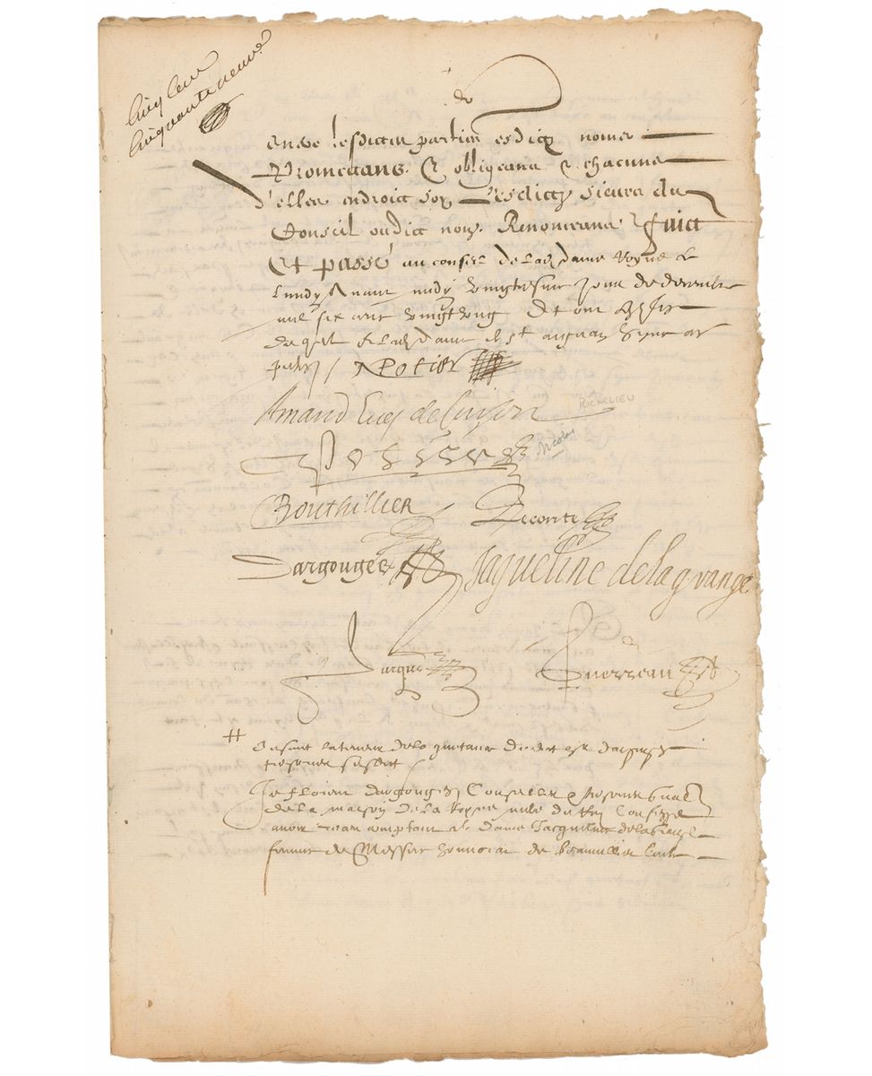 French cardinal and statesman (1585–1642) who served as chief minister from 1624 until his death, widely considered the world’s first prime minister. Very rare manuscript DS in French, signed by Richelieu as Bishop of Lucon, eight pages both sides, 8.25 x 13.5, 1625. Lengthy untranslated council minutes signed on the 13th page by Richelieu, as the Bishop of Lucon, and countersigned by seven other council members including Nicolas Potier (Chancellor of France), Claude Bouthillier (Councillor), Florent D’Argouges (Treasurer), Nicolas Le Coute (Councillor), and Jacqueline de la Grange, (daughter of Étienne la Grange, president of the French Parliament), whose bold and large signature appears at the bottom of seven pages, and additionally signed by four others on the final page. In fine condition, with light intersecting folds, weak binding, and some mild toning along edges. Scarce in any form, this is an especially intriguing document as Richelieu had recently replaced Charles, duc de La Vieuville, as the king’s principal minister, beginning a five-year power struggle with Marie de Medici, resulting in her eventual exile.