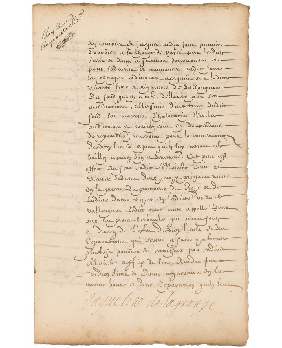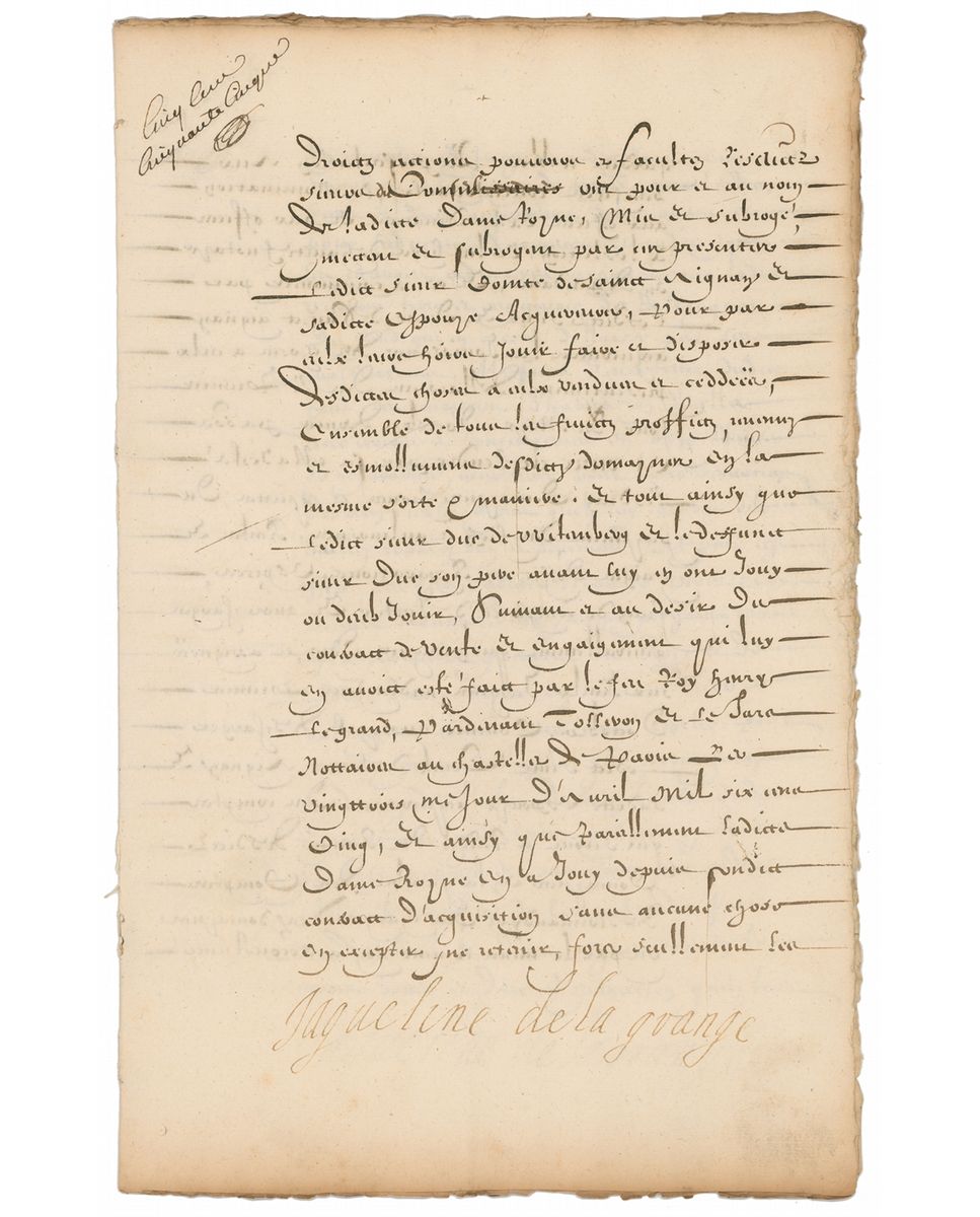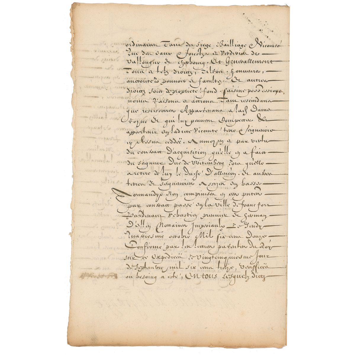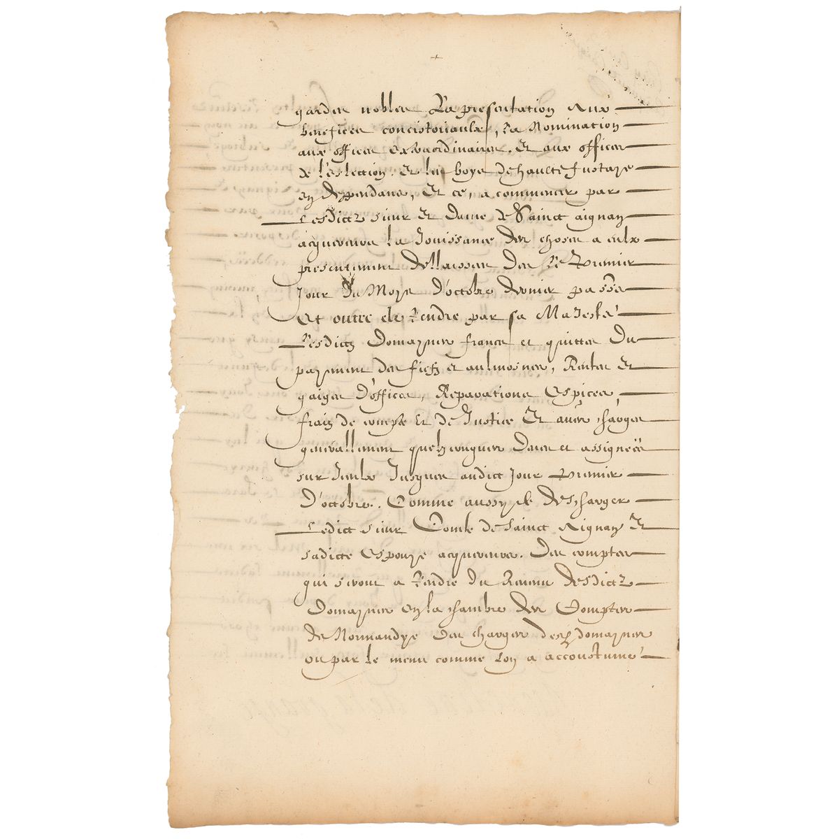 French cardinal and statesman (1585–1642) who served as chief minister from 1624 until his death, widely considered the world’s first prime minister. Very rare manuscript DS in French, signed by Richelieu as Bishop of Lucon, eight pages both sides, 8.25 x 13.5, 1625. Lengthy untranslated council minutes signed on the 13th page by Richelieu, as the Bishop of Lucon, and countersigned by seven other council members including Nicolas Potier (Chancellor of France), Claude Bouthillier (Councillor), Florent D’Argouges (Treasurer), Nicolas Le Coute (Councillor), and Jacqueline de la Grange, (daughter of Étienne la Grange, president of the French Parliament), whose bold and large signature appears at the bottom of seven pages, and additionally signed by four others on the final page. In fine condition, with light intersecting folds, weak binding, and some mild toning along edges. Scarce in any form, this is an especially intriguing document as Richelieu had recently replaced Charles, duc de La Vieuville, as the king’s principal minister, beginning a five-year power struggle with Marie de Medici, resulting in her eventual exile.