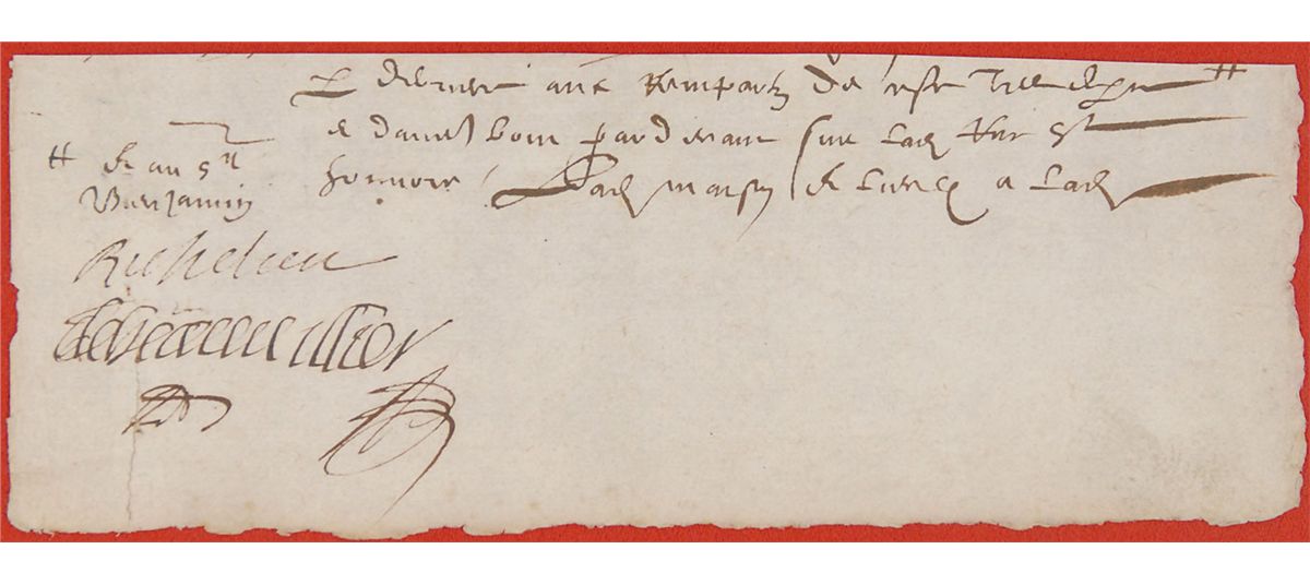 French cardinal and statesman (1585–1642) who served as chief minister from 1624 until his death, widely considered the world’s first prime minister. Scarce partial manuscript DS in French, signed “Richelieu,” one page, 8.5 x 3, no date. The concluding portion of an untranslated document. Mounted to a matted engraved portrait of Richelieu to an overall size of 12 x 13. In fine condition, with expected document wear and a small repaired tear to lower left.