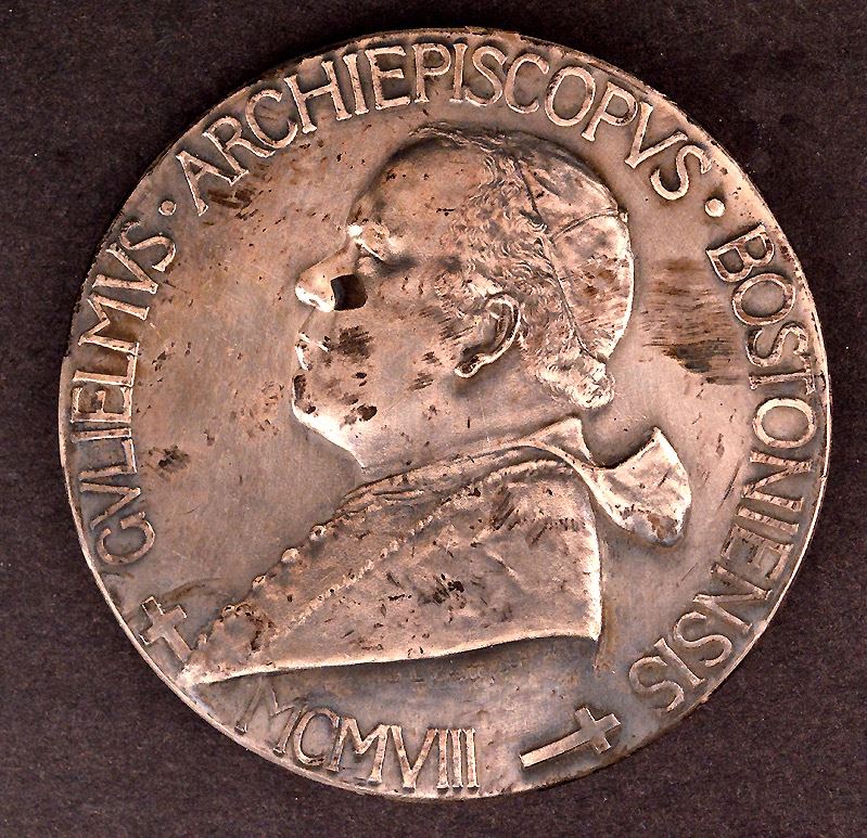 United States, Cardinal William O'Connell Centennial medal, Obv: Bust left, "GULIELMUS ARCHIEPISCOPUS BOSTONIENSIS", "MCMVIII", below; Rev: Papal coat of arms, "ANNO CENIESIMO DIOECESEOS FELICITER PERACTO", "VIGOR IN ARDUIS" on ribbon, below; Ar, 76mm, 200.82gms, by Bela Lyon Pratt. VF, toning, spots, a few hairlines; Cardinal O'Connell was the Archibishop of Boston. The die for the medal was made by Whitehead Hoag Co, Boston, MA on 10/27/1908. Five-hundred (500) large medal were cast, as well as 115,000 smaller ones.