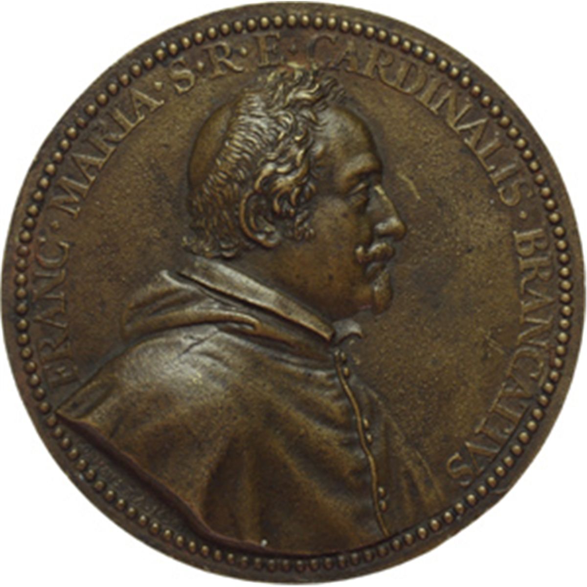 Medaglie e Placchette. Cardinale Francesco Maria Brancaccio (1592-1675). Placchetta uniface, circa 1636. Vann.-Tod. Bargello II/335. AE. mm. 78.50 Inc. Johann Jacob Kormann. Fusione posteriore. Bella patina marrone. SPL+.