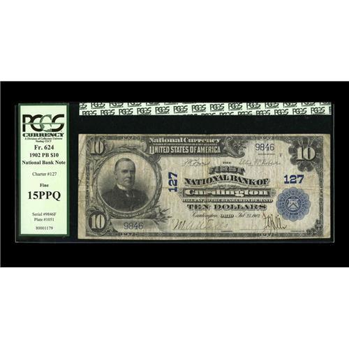<B>Cardington, OH</B></I> - $10 1902 Plain Back Fr. 624 <B>The First NB </B></I> Ch. # 127<BR>This <B>PCGS Fine 12</B></I> note is from the sole issuer in this Morrow County locale. The large census stands at 10 pieces, with five being $10 Plain Backs, including this previously documented example. This nicely margined Third Charter is from a bank scarce enough that it should be worth in the range of...