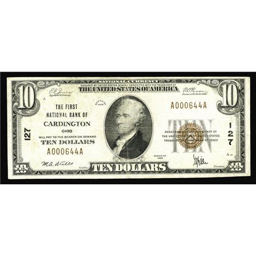 <B>Cardington, OH</B></I> - $10 1929 Ty. 1 <B>The First NB</B></I> Ch. # 127<BR>This <B>Very Fine</B></I> $10 was once wet. Officers M.A. Wells and F.P. Hills closed the doors of this bank for the last time on October 29, 1931. Before the arrival of this note on the numismatic scene, only 16 small had been previously documented by Kelly.