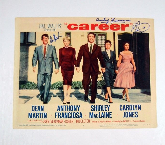 The cult classic drama "Career" (1959) was one of the first brave productions to actually show the horrors of the Hollywood Blacklist due to the terrors of the McCarthy witch hunts in the 1950's. Co-written by celebrated blacklisted writer Dalton Trumbo, it is the story of an actor, who after showing his patriotism and courage fighting in both WWII and Korea, comes home to face the cowards of HUAC who blacklist him, making it impossible for him to get any work in Hollywood. The film was nominated for three Academy Awards and won a Golden Globe Award. It also holds the distinction of being the first film for Dean Martin after his breakup with Jerry Lewis. Since he still had a contract with Hal Wallis who produced the Martin & Lewis films, he owned him another movie, and decided to try his hand at drama. It was a good choice and he went on to distinguish himself in many great films as a dramatic actor. Also in the cast was Anthony Franciosa, Shirley MacLaine and Caroline Jones. This is a rare original lobby card from the movie with the signatures of Dean Martin, Anthony Franciosa and legendary songwriter Sammy Cahn who had his work featured in the movie. In good condition. Lobby Card is 11'x14".