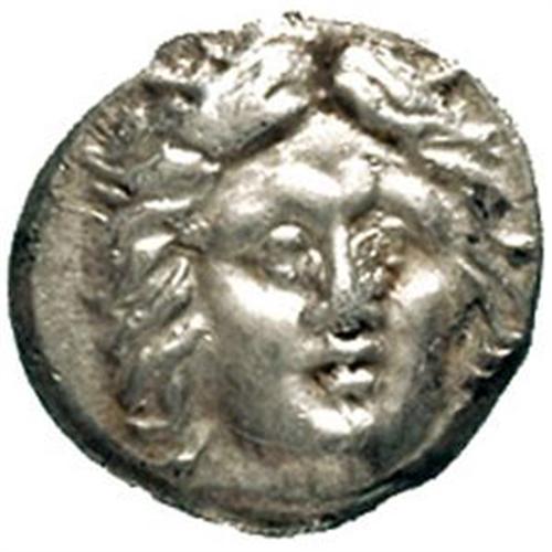 Asia Greca. Caria-Rodi. Dracma, 387-304 a.C. D/ Testa frontale di Helios, rivolta tre quarti a destra. R/ Rosa. Cfr. BMC. 18.234, 38. gr. 2.75 AG. SPL.