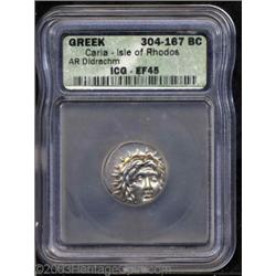 <TABLE cellSpacing=0 cellPadding=0 width="100%" bgColor=#000000 border=0><TBODY> <TR><TD width="100%"><TABLE cellSpacing=1 cellPadding=3 width="100%" border=0><TBODY><TR><TD width="100%" bgColor=#79735c><FONT face=arial color=#ffffff size=3><B>Description</B> </FONT></TD></TR><TR><TD width="100%" bgColor=#ffffff><FONT face=arial size=2><B>Carian Islands, Rhodes.</B></I> Ca. 250-230 B.C. AR didrachm (19 mm). Radiate head of Helios facing slightly right / Rose, bud to right; Athena standing left, holding aphlastron in left field; magistrate, Mnasimachos. SNG Finland (Keckman) 537-8; R. J. H. Ashton, "Rhodian Coinage and the Colossus," <I>RN</B></I> (1988), Series 4. XF45 ICG. </FONT></TD></TR></TBODY></TABLE></TD></TR></TBODY></TABLE><BR><A name=PricesRealized></A><TABLE cellSpacing=0 cellPadding=0 width="100%" bgColor=#000000 border=0><TBODY><TR><TD width="100%"><TABLE cellSpacing=1 cellPadding=3 width="100%" border=0><TBODY><TR><TD width="100%" bgColor=#79735c><A name=PR><FONT face=arial color=#ffffff size=3><B>Previous Prices from Heritage Auctions</B> </FONT></A></TD></TR><TR><TD bgColor=#f6f6ed>No Prior Data Recorded </TD></TR><TR><TD bgColor=#ffffff><FONT face=arial size=1 ?>PLEASE NOTE: All prices realized reflect the final hammer price PLUS the buyer's premium in auctions that charge a buyer's premium. Each item has a notation at the top of the listing indicating whether that lot included a buyer's premium. Example: A item that sells with a final hammer price of $100 and a 20% buyer's premium will display with a price realized of $120. All information listed is intended to be as accurate as possible, but errors are possible. Please use this guide carefully and inform us of any inaccuracies. </FONT></TD></TR></TBODY></TABLE></TD></TR></TBODY></TABLE><BR><TABLE cellSpacing=0 cellPadding=0 width="100%" bgColor=#000000 border=0><TBODY><TR><TD width="100%"><TABLE cellSpacing=1 cellPadding=3 width="100%" border=0><TBODY><TR><TD width="100%" bgColor=#79735c colSpan=6><FONT face=arial color=#ffffff size=3><B>Price Guide*</B> </FONT></TD></TR><TR bgColor=#f6f6ed><TD align=middle><B>Grade</B> </TD><TD align=middle><B>Coin World<BR>(Trends)</B> </TD><TD align=middle><B>Numismedia<BR>Retail</B> </TD><TD align=middle><B>Numismedia<BR>Wholesale</B> </TD><TD align=middle><B>Coin<BR>Universe</B> </TD><TD align=middle><B>Heritage<BR>Value Index</B> </TD></TR><TR bgColor=#ffffff><TD colSpan=6><FONT size=1>*All information listed is intended to be as accurate as possible, but errors are possible. No item may be returned or refused based on this information which is provided as a service to our customers. You should contact each pricing source directly to determine the accuracy of this information. </FONT></TD></TR></TBODY></TABLE></TD></TR></TBODY></TABLE><BR><TABLE cellSpacing=0 cellPadding=0 width="100%" bgColor=#000000 border=0><TBODY><TR><TD width="100%"><TABLE cellSpacing=1 cellPadding=3 width="100%" border=0><TBODY><TR><TD width="100%" bgColor=#79735c><FONT face=arial color=#ffffff size=3><B>Population Guide</B> </FONT></TD></TR><TR bgColor=#ffffff> Important notice: Heritage usually auctions material at the rate of 200-250 lots per hour. On some occasions eBay Live bid software or the Internet may not be able to keep up with the pace of the auction. We recommend placing a realistic absentee bid now as insurance to avoid disappointment. Occasionally the auctioneer may eliminate or reject an eBay Live bid, and the auctioneer may also reopen a lot after the close of the eBay live bidding (usually because we missed an audience bid), and may reject your bid even if it shows you as the winning bidder. By bidding via eBay Live, you agree that Heritage may award the lot to another bidder at its sole discretion under the circumstances described above or any other reasonable circumstances. Also please note that all Heritage lots purchased through eBay Live carry a 20% Buyer's Premium. Please make sure you read the Terms and Conditions before you bid.</TD></TR></TBODY></TABLE></TD></TR></TBODY></TABLE>