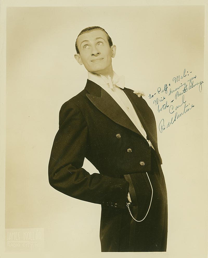 Very early vintage glossy 8 x 10 photo of Ballantine in a bow tie and tails, signed and inscribed in fountain pen “To Peg & Mel:-Nice knowing you both-Best always, Carl Ballantine.” In fine condition, with scattered light creases and surface marks.