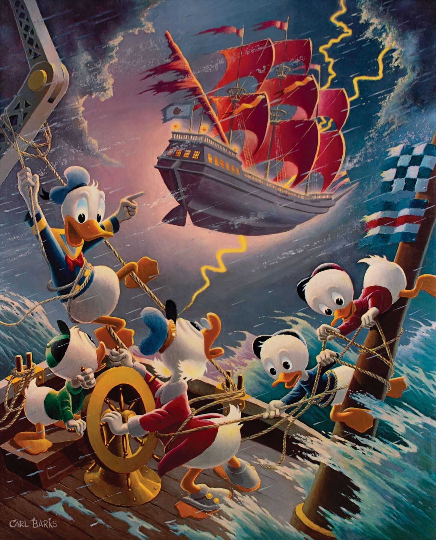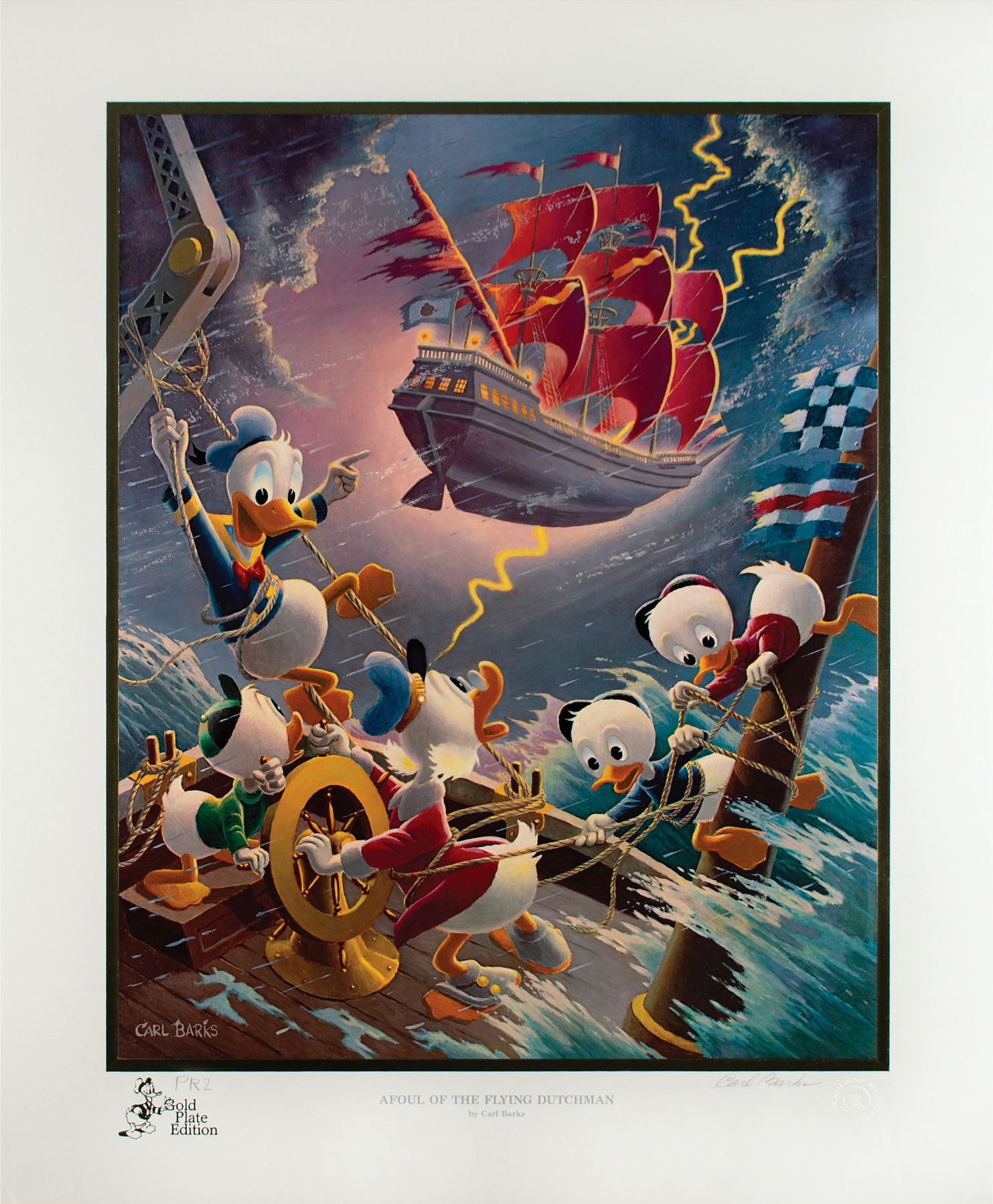Limited edition color 21 x 25.5 lithograph of a Carl Barks oil painting entitled 'Afoul of the Flying Dutchman,' Gold Plate Edition number PR 2, printed on Opalesque paper by The Black Box of Chicago, signed in the lower border in pencil by Barks. The scene depicts Donald Duck, his nephews Huey, Dewey, and Louie, and Uncle Scrooge McDuck, searching stormy waters in the South Atlantic and finding a legendary ghost ship. The lithograph has been produced under license from The Walt Disney Company by Another Rainbow Publishing, Inc. In fine condition. Accompanied by a certificate of authenticity. This action-packed painting is based upon ‘The Flying Dutchman,’ which was originally published in Uncle Scrooge #25 (March 1959).