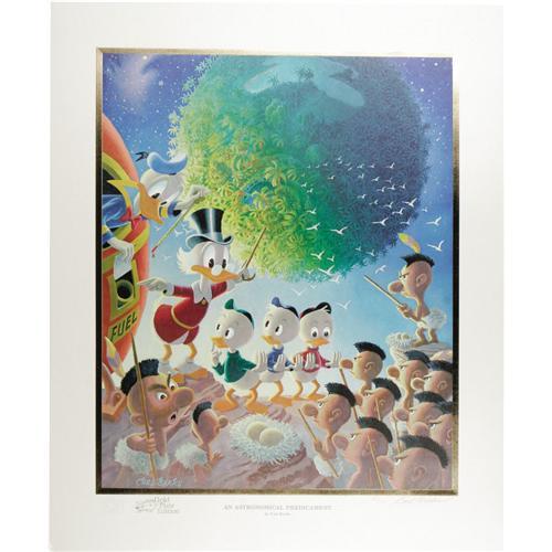 <B>Carl Barks - ""An Astronomical Predicament"" Gold Plate Edition Limited Signed and Numbered Lithograph, 81/100 (Another Rainbow, 1990).</B></I> Uncle Scrooge decides to buy a second-hand rocket ship and fly his family to an asteroid, in Carl Barks' story ""Island in the Sky,"" published in Uncle Scrooge #29. ""An Astronomical Predicament"" is based on that famous comic book story and is the fifteenth Walt Disney oil painting by Barks in a continuing limited edition lithograph series. This print, on silk-textured Opalesque paper, is signed and numbered in pencil by Barks, and measures 21"" x 25.5"". In Excellent condition, this print includes a certificate of authenticity from Another Rainbow. <BR><BR><b>Shipping:</b> Flat Material, Large (<a target=""_blank"" href=""http://www.heritageauctions.com/common/shipping.php"">view shipping information</a>)