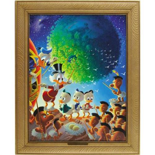 <B>Carl Barks - "An Astronomical Predicament" Oil Painting Original Art (1990).</B></I> The way-out sixties found Uncle Scrooge and Donald taking part in the space race. This oil painting, based on the yarn "Island in the Sky" from <B>Uncle Scrooge</B></I> #29, shows Uncle Scrooge, Donald, Huey, Dewey, and Louie as they are confronted by the hungry inhabitants of a barren asteroid. The image area of this masterwork measures 19" x 25.5", and it's been framed to an overall size of 24.5" x 31". This piece is in Excellent condition.<BR><BR><b>Shipping:</b> Framed - without Glass, Large (<a target="_blank" href="http://www.heritageauctions.com/common/shipping.php">view shipping information</a>)