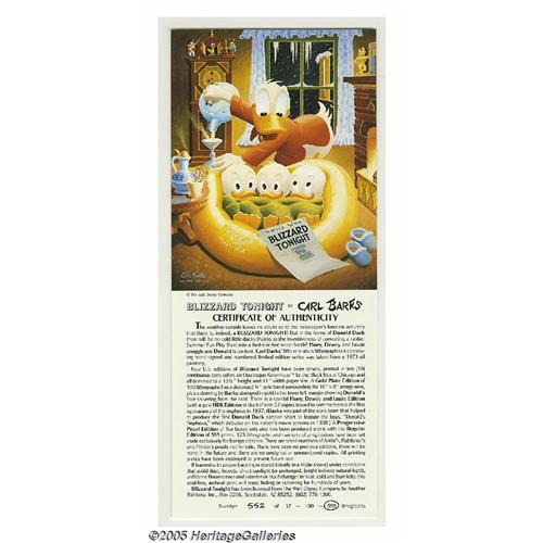 <B>Carl Barks - ""Blizzard Tonight"", Regular Edition Miniature Lithograph, numbered 552/595 (Another Rainbow, 1993).</B></I> The weather outside leaves no doubt as to the newspaper's forecast accuracy that there is, indeed, a blizzard tonight. Thanks to Donald Duck's inspired use of a rubber ""summer fun play boat"" as a hot water bottle, Huey, Dewy, and Louie will remain comfy! This was the fifth miniature lithograph issued by Another Rainbow. The lithograph is numbered 552/595. The print has an overall size of 11"" x 13.5"". Carl Barks signed the lithograph at the lower right, and the print is in Excellent condition. Also included in this lot is a numbered Certificate of Authenticity. <BR><BR><B>Important notice:</B> Heritage usually auctions material at the rate of 200-250 lots per hour. On some occasions eBay Live bid software or the Internet may not be able to keep up with the pace of the auction. We recommend placing a realistic absentee bid now as insurance to avoid disappointment. Occasionally the auctioneer may eliminate or reject an eBay Live bid, and the auctioneer may also reopen a lot after the close of the eBay live bidding (usually because we missed an audience bid), and may reject your bid even if it shows you as the winning bidder. By bidding via eBay Live, you agree that Heritage may award the lot to another bidder at its sole discretion under the circumstances described above or any other reasonable circumstances. Since eBay bids are not shown to us until we open the lot on the floor, we treat those bids just like floor bids. In most cases the floor responds before the eBay bid is presented to us, due to Internet lag time, so for consistency we have made it a policy that floor bids are always considered first over tie eBay live bids. Also please note that all Heritage lots purchased through eBay Live carry a 20% Buyer's Premium. Please make sure you read the Terms and Conditions before you bid. This lot is being auctioned in conjunction with a li