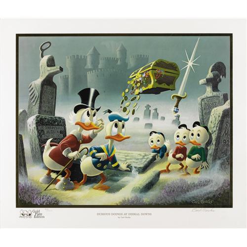 <B>Carl Barks - "Dubious Doings at Dismal Downs" Gold Plate Edition Lithograph #37/100 (Another Rainbow, 1986).</B></I> The indomitable patriarch of the clan, Uncle Scrooge McDuck, and his nephews Donald Duck, Huey, Dewy, and Louie Duck, are riveted by the spellbinding presence of an unseeable apparition carrying a chest of treasures and wielding a jewel-encrusted sword, in this continuous-tone, twelve-color lithograph. This is the ninth Carl Barks lithograph in the Another Rainbow series. The print measures 21.5" x 25", with a 16" x 20" image area. Signed by Carl Barks. Framed and matted, and in Excellent condition. Includes a certificate of authenticity. <BR><BR><B>Important notice:</B> Heritage usually auctions material at the rate of 200-250 lots per hour. On some occasions eBay Live bid software or the Internet may not be able to keep up with the pace of the auction. We recommend placing a realistic absentee bid now as insurance to avoid disappointment. Occasionally the auctioneer may eliminate or reject an eBay Live bid, and the auctioneer may also reopen a lot after the close of the eBay live bidding (usually because we missed an audience bid), and may reject your bid even if it shows you as the winning bidder. By bidding via eBay Live, you agree that Heritage may award the lot to another bidder at its sole discretion under the circumstances described above or any other reasonable circumstances. Since eBay bids are not shown to us until we open the lot on the floor, we treat those bids just like floor bids. In most cases the floor responds before the eBay bid is presented to us, due to Internet lag time, so for consistency we have made it a policy that floor bids are always considered first over tie eBay live bids. Also please note that all Heritage lots purchased through eBay Live carry a 22.5% Buyer's Premium. Please make sure you read the Terms and Conditions before you bid. This lot is being auctioned in conjunction with a live floor auction by Heritage Auction Galleries. All final auction and invoice information will be supplied by Heritage Auction Galleries, and all other information should be considered preliminary. Lot:41001 <BR><BR><B>Winning Notification and Billing:</B> After the FINAL session in this auction is complete, Heritage will send e-mail and snail mail invoices. This process normally takes several days. All final auction and invoice information will be supplied by Heritage Auction Galleries, and all other information should be considered preliminary. <BR><BR>This auction will be conducted on a live auction floor and over the Internet through eBay Live. If you choose to place an absentee bid, please take a moment to <font color='#0000ff'><u><a href='http://pages.ebay.com/liveauctions/help/before/laabsentee.html'>learn how eBay Live absentee bidding works</a></u></font><font color='#000000'>