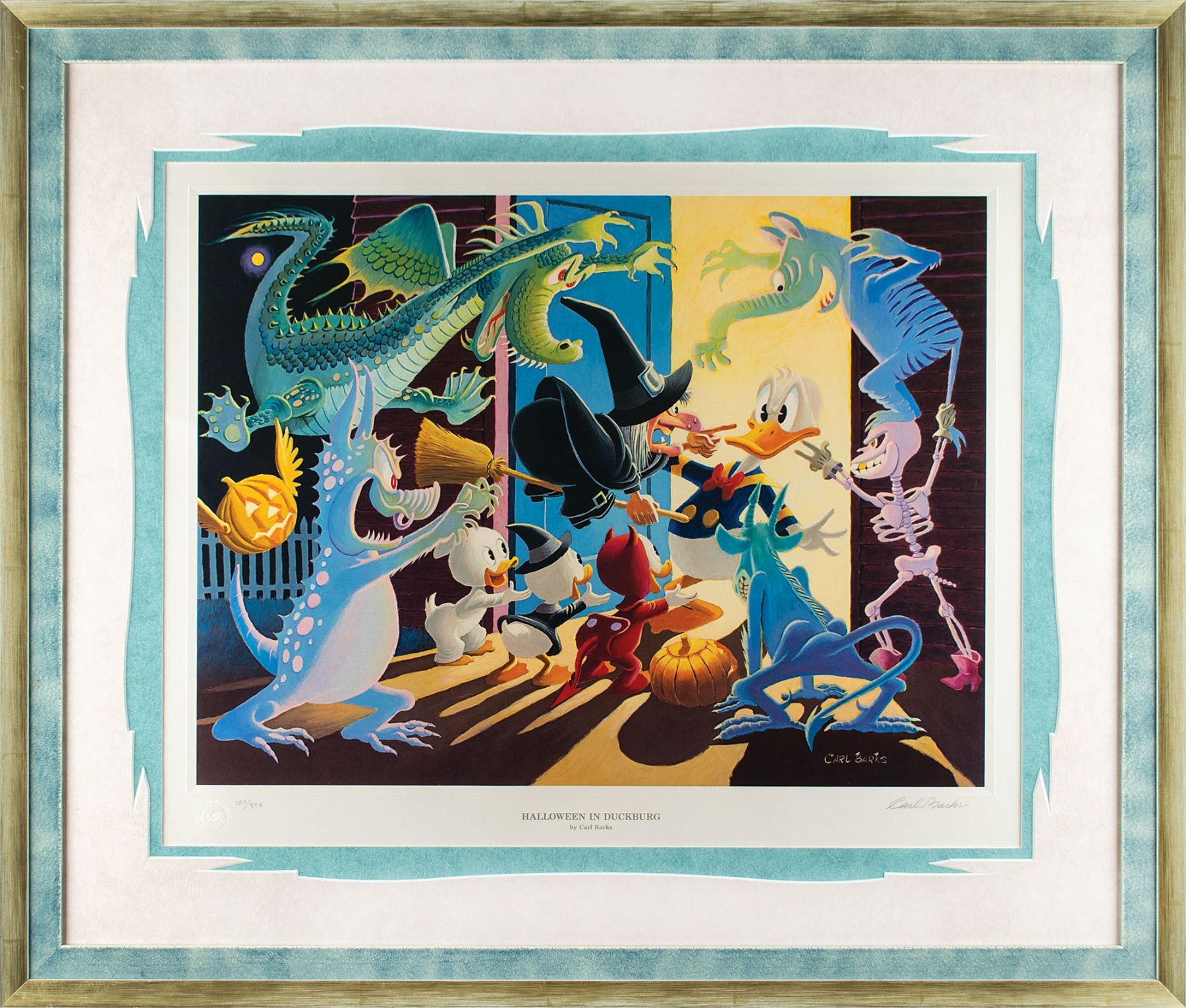Limited edition color 24 x 19 lithograph of a Carl Barks oil painting entitled 'Halloween in Duckburg,' numbered 120/395, printed in 16 colors on Opalesque Keramique by The Black Box of Chicago, signed in the lower border in pencil by Barks. The harrowing Halloween scene shows Donald Duck opening his door to an array of ghastly trick-or-treaters, which includes Huey, Dewie, and Louie, Witch Hazel, and other ghouls and creatures. Attractively double-matted and framed to an overall size of 33 x 28. In fine condition. 'Halloween in Duckburg,’ the nineteenth Carl Barks lithograph in a series produced by Another Rainbow Publishing, is an updated take on his front cover to the comic book Donald Duck #26, released in November 1953, which featured the lead story, ‘Trick or Treat.’ Accompanied by a certificate of authenticity.