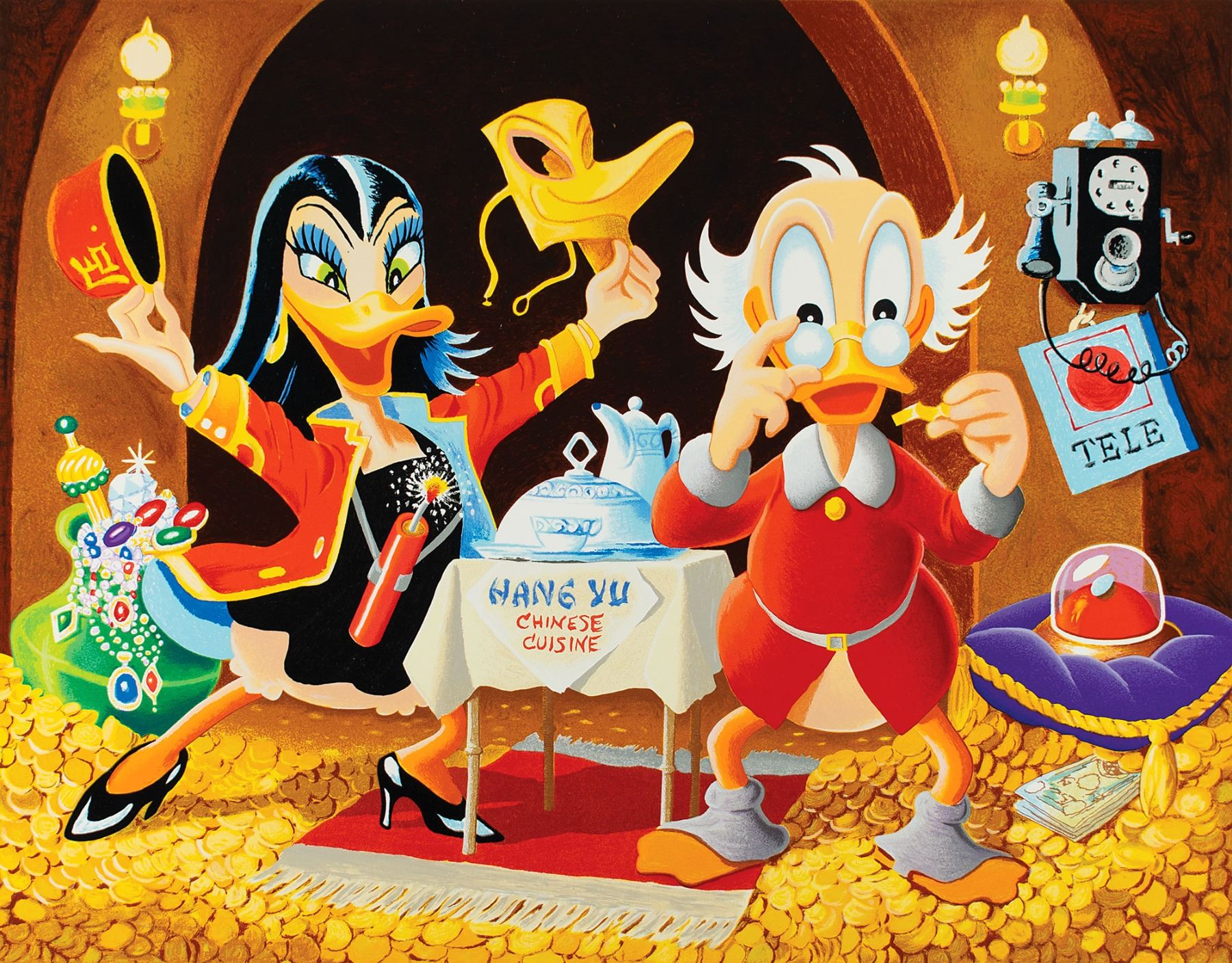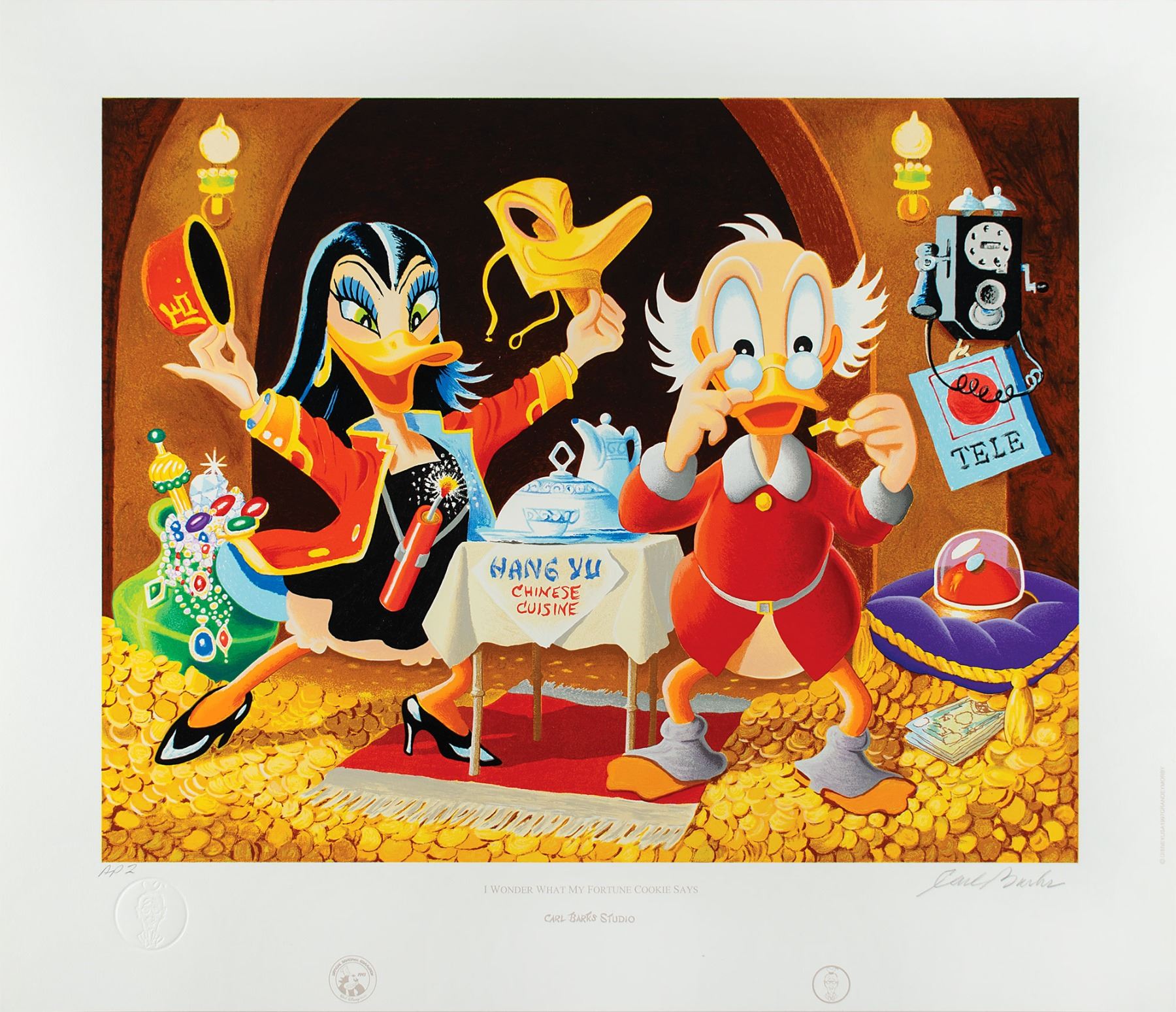Limited edition color 24 x 20.75 serigraph of a Carl Barks oil painting entitled ‘I Wonder What My Fortune Cookie Says,’ numbered AP 2, printed in 53 colors and created for the 1997 Orlando Disneyana Convention, signed in the lower border in pencil by Barks. The scene shows Uncle Scrooge McDuck reading a fortune in his coin-filled money bin, with Magica De Spell poised to make an explosive surprise with her Chinese food delivery. The lower left is blindstamped by the Carl Barks Studio. In fine condition. Accompanied by a certificate of authenticity from the Disneyana Convention.