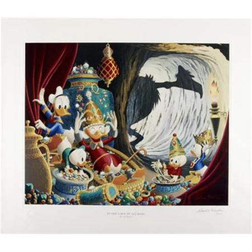 <B>Carl Barks - "In the Cave of Ali Baba" Lithograph Print #14/595 (Another Rainbow, 1997).</B></I> Uncle Scrooge, Donald Duck and his nephews frolic amongst a hidden hoard of wealth, unaware that Ali Baba's ancient and ill-tempered guardian is about to stick its beak into the frolic, in this Carl Barks lithograph. Printed in fifteen colors, this print measures 25" x 21.5" and has a 20" x 16" image area. Signed and numbered by Carl Barks and in Excellent condition. This lot includes the COA.<BR><BR><b>Shipping:</b> Flat Material, Large (<a target="_blank" href="http://www.heritageauctions.com/common/shipping.php">view shipping information</a>)