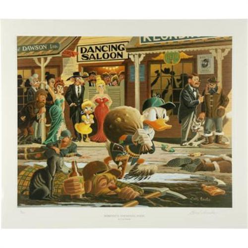 <B>Carl Barks - "Nobody's Spending Fool" Lithograph #4/350 (Another Rainbow, 1997).</B></I> The twenty-fourth lithograph in a series of limited, full-size, signed and numbered prints produced by Another Rainbow, "Nobody's Spending Fool" features a young Uncle Scrooge as a young miner, as he was in Dawson City in 1897. Measures 23" x 19.5" with a 20" x 16" image area. In Excellent condition. Signed by Carl Barks. Includes a certificate of authenticity.<BR><BR><b>Shipping:</b> Flat Material, Large (<a target="_blank" href="http://www.heritageauctions.com/common/shipping.php">view shipping information</a>)