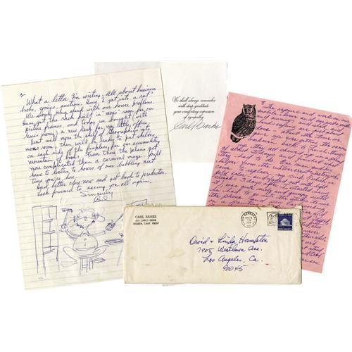 <B>Carl Barks Original Correspondence and Memorabilia (1974-93).</B></I> Ten letters from Gar and Carl Barks are included in this batch of personal correspondence and memorabilia from a long-time fan. The letters are signed by Carl on some, by Gar on others; Carl did include a couple of small sketches (including a wacky self-portrait) on two letters. In addition, there are clippings, a transcript of a Barks interview conducted by Malcolm Willits, a program from Gar's funeral and a ""thank you"" card from Carl, a signed Disney Art Editions program, a Russ Cochran catalog with a Barks cover, copies of model sheets, and a Carl Barks pin-back button (#3 in the Famous Cartoonist Series, stained). Quite a treasure trove of Barks-related memorabilia!<BR><BR><b>Shipping:</b> Flat Material, Small (<a target=""_blank"" href=""http://www.heritageauctions.com/common/shipping.php"">view shipping information</a>)