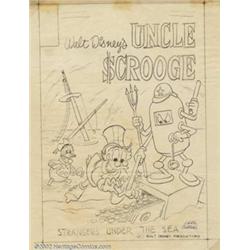 Carl Barks - Original Preliminary Cover Art for Walt Disney's Uncle Scrooge #46 (Gold Key Comics, 1963). During his tenure as "The Good Duck Artist," it was a common practice for Carl Barks to submit several pencil preliminary sketches before settling on a final design for his Uncle Scrooge covers. That process is illustrated here, in a pencil prelim for what would become Uncle Scrooge #46, "Lost Under the Sea." All the elements that can be seen in the final cover are present here: the robot cop, the safe full of money, the mast of the sunken ship, as well as Donald, and Scrooge himself. This prelim, done in pencil on vellum, measures approximately 9" x 11.5" with an image area of approximately 7.25" x 10.25", and is in very good condition. There is some evidence of tape at the top of the piece, and a 1.5" x 5" chunk missing from the right edge, but neither of these defects affects the art in any way. Additionally, the piece is signed by Barks in the lower right corner. Only a handful of Barks' cover pieces are known to exist, making this a true rarity and a must for the avid Uncle Scrooge fan. Important notice: We expect to be auctioning lots at the rate of 200-250 per hour. Sometimes eBay Premier live bid software cannot keep up with that pace, so we strongly recommend that you place a realistic proxy bid now as insurance to avoid disappointment. Also please note that all Heritage/CAA lots purchased through eBay Premier carry a 20% Buyer's Premium. Please make sure you read the Terms and Conditions.