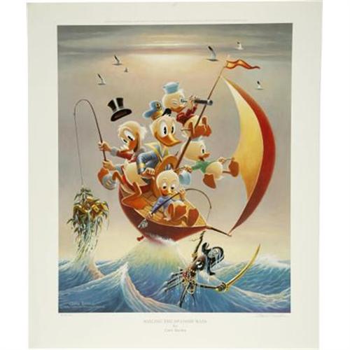 <B>Carl Barks - "Sailing the Spanish Main" Lithograph #4/245 (Another Rainbow, 1982).</B></I> Carl Barks reworked one of his most famous comic covers to include Scrooge in this inaugural lithograph in Another Rainbow's series of limited edition lithographs. The most sought after and valuable of all the Barks lithographs, "Sailing the Spanish Main" measures 20" x 24" and has a 16" x 20" image area. In Excellent condition. Signed by Carl Barks. Includes a certificate of authenticity.<BR><BR><BR><b>Shipping:</b> Flat Material, Large (<a target="_blank" href="http://www.heritageauctions.com/common/shipping.php">view shipping information</a>)