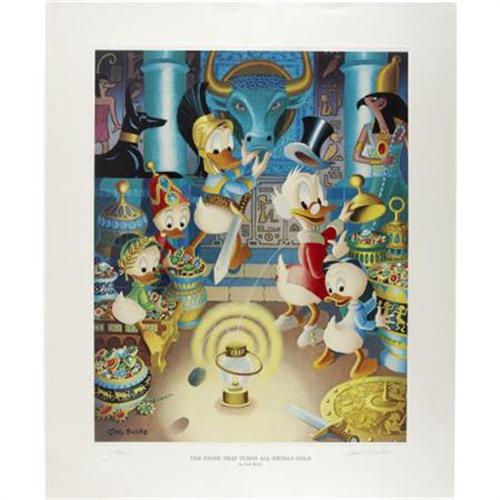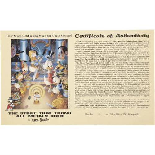 <B>Carl Barks - The Stone That Turns All Metals Gold, Regular Edition Lithograph, numbered 14/350 (Another Rainbow, 1991).</B></I> As the Certificate of Authenticity for this superb lithograph notes, "Carl Barks' legendary 1955 comic book story, 'The Fabulous Philosopher's Stone' tells of the fantasticatillionare, Uncle Scrooge McDuck, who researches a myth in ancient books of bygone pagan kings and an alchemist who fused four metals into a ball of mother-of-gold, thereby making a true Philosopher's Stone that -- by touch -- turns all metals into pure gold!" The overall size of the print is 21" x 25.5", while the image area is 16" x 20". Carl Barks signed the print, in pencil, at the lower right, and the print is in Excellent condition. Also included in the lot is the numbered Certificate of Authenticity.<BR><BR><b>Shipping:</b> Flat Material, Large (<a target="_blank" href="http://www.heritageauctions.com/common/shipping.php">view shipping information</a>)
