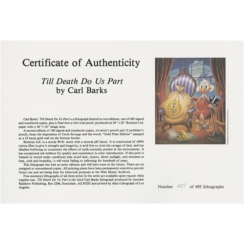 <B>Carl Barks - Till Death Do Us Part, Regular Edition Lithograph, numbered 427/495 (Another Rainbow, 1983).</B></I> Based on a sketch done in 1961 for Michael J. Cronin of the Harvard Business School, the third lithograph from Another Rainbow featured Uncle Scrooge posing with a huge sack of 24 karat gold dust! The overall size of this lithograph is 20" x 24". The print is numbered 427/495, Carl Barks signed the print, in pencil, at the lower right. The condition of the print is Excellent. Also included in the lot is the print's numbered Certificate of Authenticity.