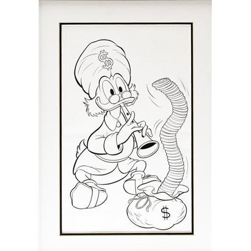 <B>Carl Barks - Uncle Scrooge #19 Cover Recreation Original Art (Another Rainbow, 1989).</B></I> Uncle Scrooge animates a stack of coins with his golden musical touch, in this original illustration. Carl Barks recreated his original image to be used as a cover for a volume of Another Rainbow's slipcased <B>Uncle Scrooge</B></I> hardcover reprint editions. The image area measures 11" x 14". Matted and framed and in Very Good condition. <I>From the Estate of Bruce Hamilton</B></I>. <BR><BR><B>Important notice:</B> Heritage usually auctions material at the rate of 200-250 lots per hour. On some occasions eBay Live bid software or the Internet may not be able to keep up with the pace of the auction. We recommend placing a realistic absentee bid now as insurance to avoid disappointment. Occasionally the auctioneer may eliminate or reject an eBay Live bid, and the auctioneer may also reopen a lot after the close of the eBay live bidding (usually because we missed an audience bid), and may reject your bid even if it shows you as the winning bidder. By bidding via eBay Live, you agree that Heritage may award the lot to another bidder at its sole discretion under the circumstances described above or any other reasonable circumstances. Since eBay bids are not shown to us until we open the lot on the floor, we treat those bids just like floor bids. In most cases the floor responds before the eBay bid is presented to us, due to Internet lag time, so for consistency we have made it a policy that floor bids are always considered first over tie eBay live bids. Also please note that all Heritage lots purchased through eBay Live carry a 22.5% Buyer's Premium. Please make sure you read the Terms and Conditions before you bid. This lot is being auctioned in conjunction with a live floor auction by Heritage Auction Galleries. All final auction and invoice information will be supplied by Heritage Auction Galleries, and all other information should be considered preliminary. Lot:41001 <BR><BR><B>Winning Notification and Billing:</B> After the FINAL session in this auction is complete, Heritage will send e-mail and snail mail invoices. This process normally takes several days. All final auction and invoice information will be supplied by Heritage Auction Galleries, and all other information should be considered preliminary. <BR><BR>This auction will be conducted on a live auction floor and over the Internet through eBay Live. If you choose to place an absentee bid, please take a moment to <font color='#0000ff'><u><a href='http://pages.ebay.com/liveauctions/help/before/laabsentee.html'>learn how eBay Live absentee bidding works</a></u></font><font color='#000000'>
